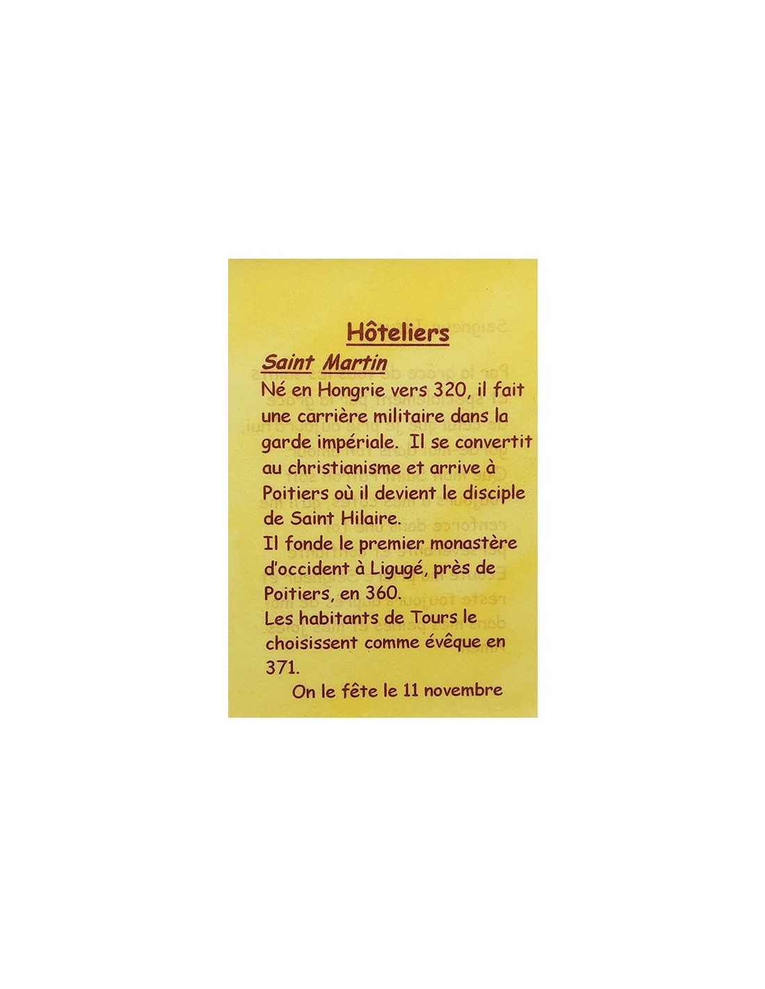 Questa cartolina è un piccolo strumento discreto per pregare i vostri santi patroni. È destinata agli albergatori e a tutti coloro che gravitano attorno a loro e spiega in poche parole il loro santo patrono: San Martino. Sul retro è scritta una breve preghiera dedicata a Gesù e alla grazia dei santi patroni per confortare negli sforzi, rafforzare nella fede, superare gli ostacoli e proteggere dai mali quotidiani.