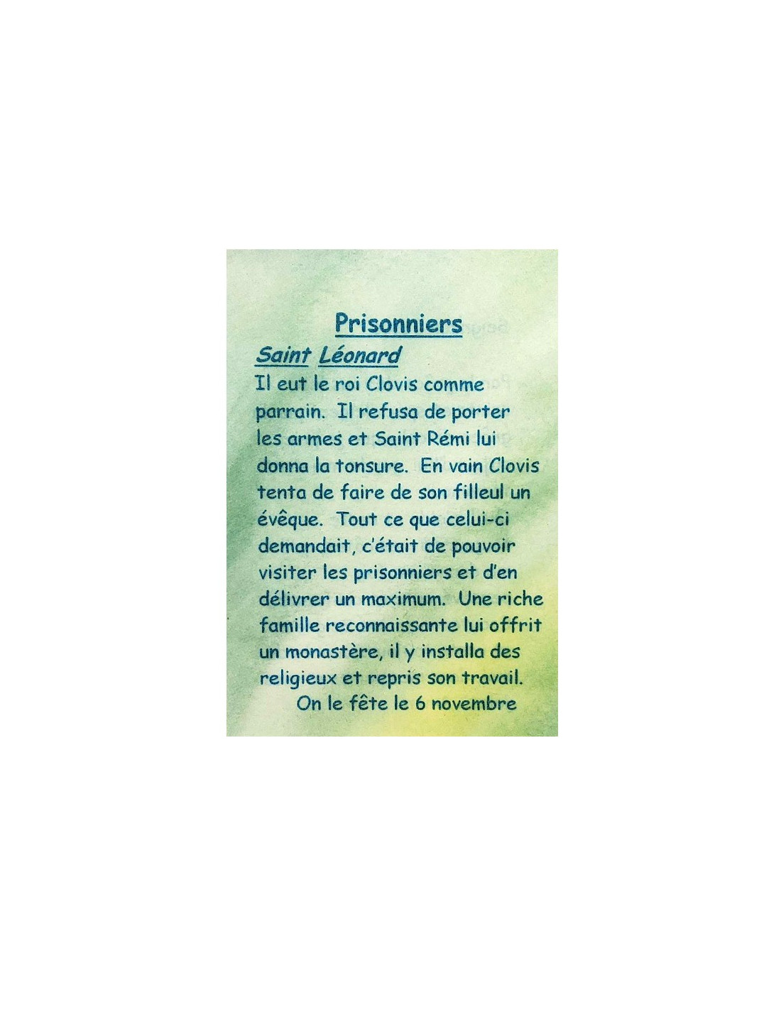 Questa cartolina è un piccolo strumento discreto per pregare i vostri santi patroni. È rivolta a tutti perché è una preghiera per i prigionieri. La cartolina spiega in poche parole il santo patrono: San Leonardo. Sul retro è scritta una breve preghiera dedicata a Gesù e alla grazia dei santi patroni per confortare nello sforzo, rafforzare nella fede, superare gli ostacoli e proteggere dai mali quotidiani.