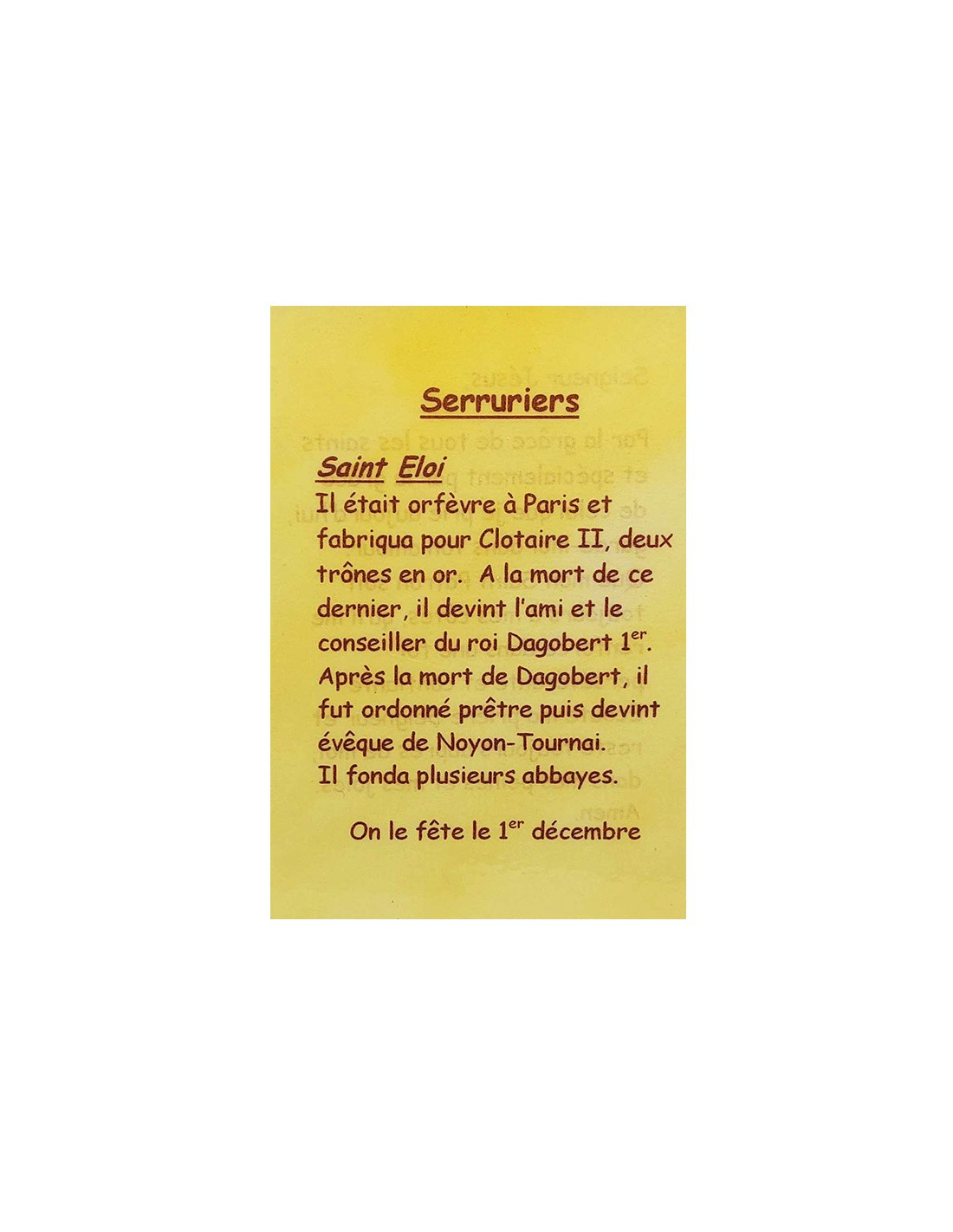 Questa cartolina è un piccolo strumento discreto per pregare i vostri santi patroni. È destinata ai fabbri e a tutti coloro che gravitano attorno a loro e spiega in poche parole il loro santo patrono: Sant'Eloro. Sul retro è scritta una breve preghiera dedicata a Gesù e alla grazia dei santi patroni per confortare negli sforzi, rafforzare la fede, superare gli ostacoli e proteggere dai mali quotidiani.
