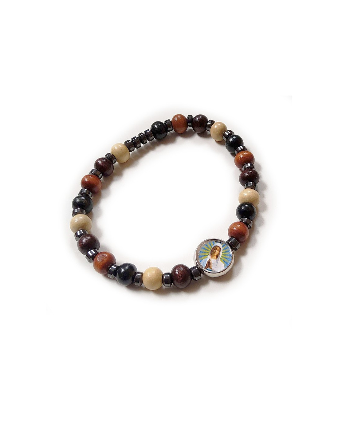 Braccialetto elastico in legno ed ematite che può essere utilizzato come una decina, detto anche dizainier, con l'immagine della Vergine di Banneux: Nostra Signora dei Poveri. Le perle di legno sono colorate di bianco, marrone e nero.