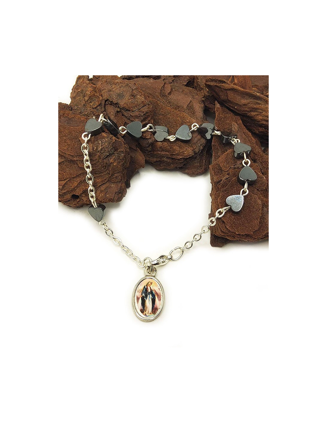 Bracciale rosario con cuori in hematite, Vergine Miracolosa e Angelo Custode