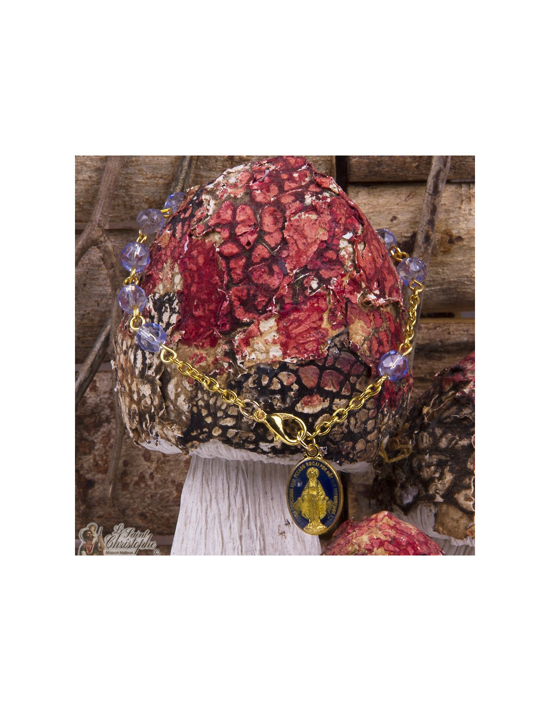 La catena è realizzata in metallo placcato oro. I grani sono in plastica blu trasparente, creando un bellissimo contrasto con l'oro. Il medaglione, in metallo placcato oro con smalto blu, rappresenta la Vergine Miracolosa. È un simbolo di protezione e guarigione.