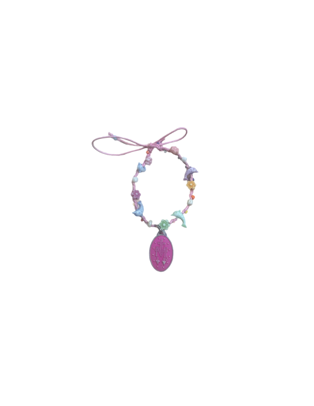 Decorato con una Medaglia Miracolosa smaltata (14 mm x 20 mm), piccoli fiori ? e delfini decorativi ?, unisce eleganza e simbolo di protezione.