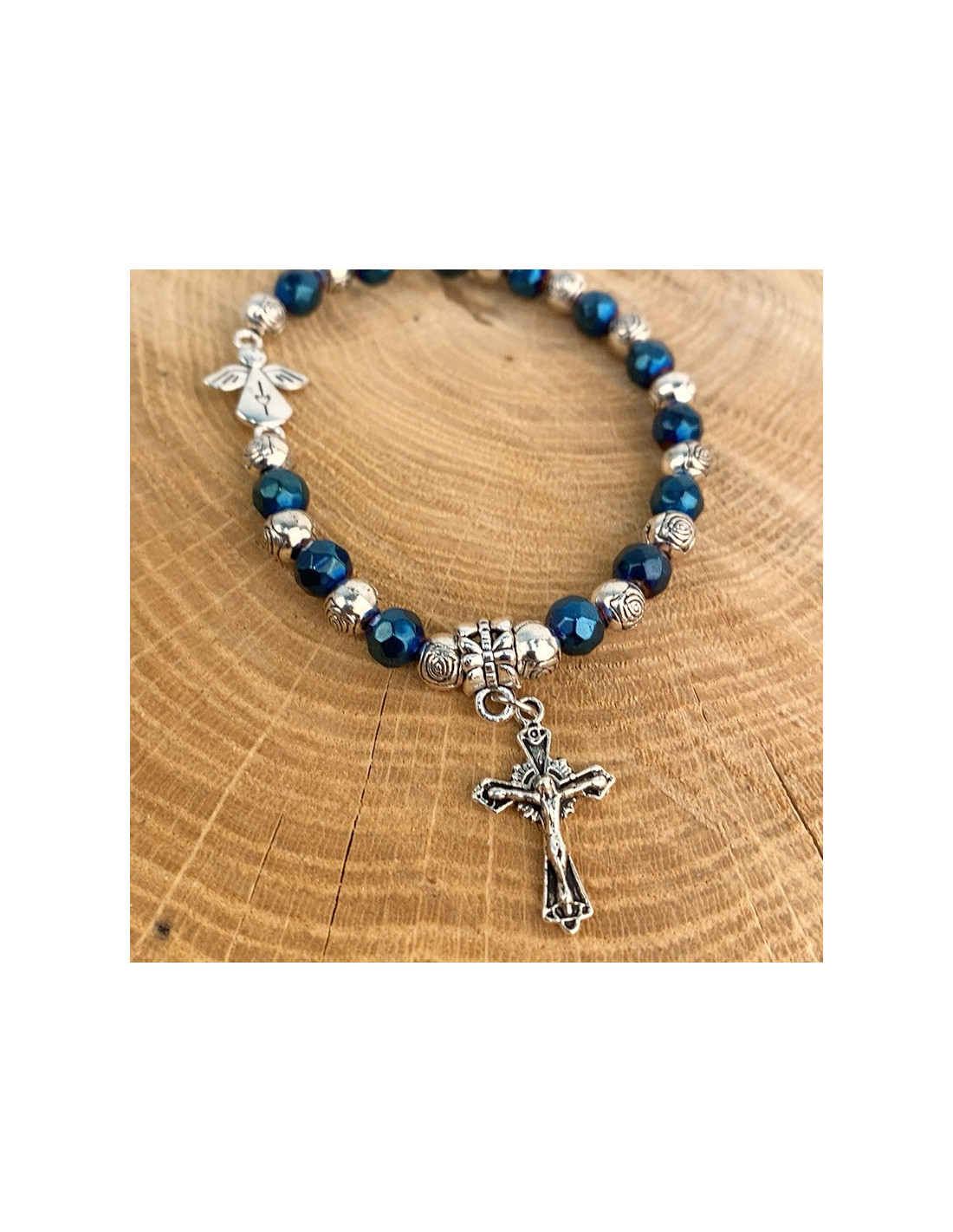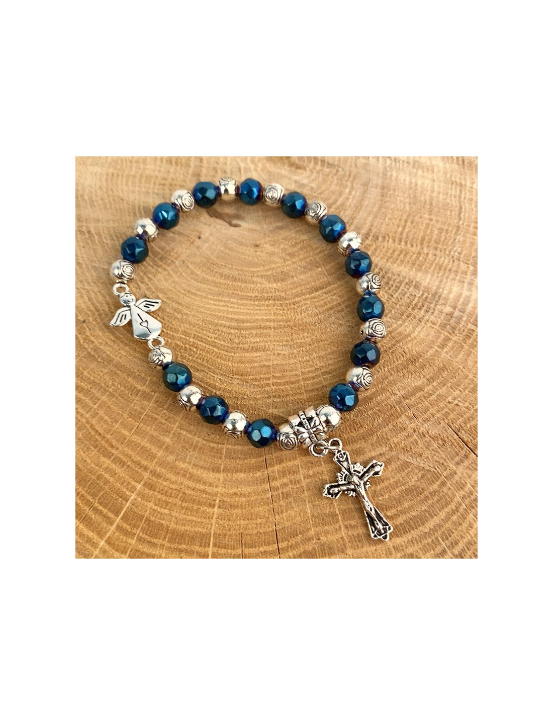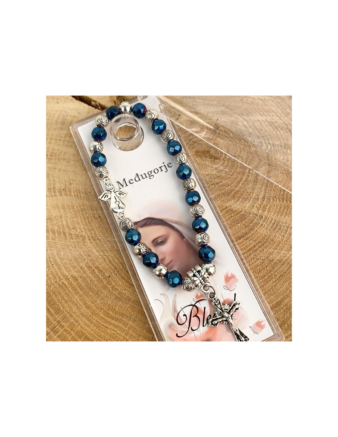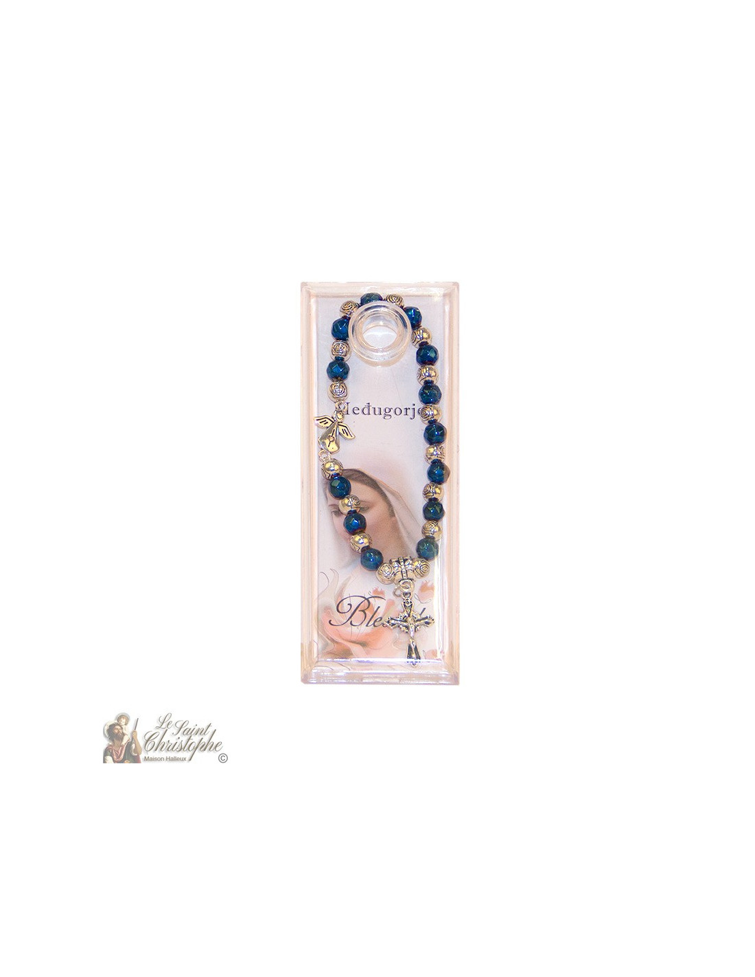 Questo braccialetto elastico, con perle lucide blu e argento tagliate a forma di rosa, è ornato da due piccoli ciondoli: un simpatico angelo decorato con un cuore e una croce con Gesù sopra. Protetto da una bella custodia trasparente, il braccialetto è corredato da un'immagine della Beata Vergine di Medjugordje. Il bracciale può essere utilizzato anche come tenainier.