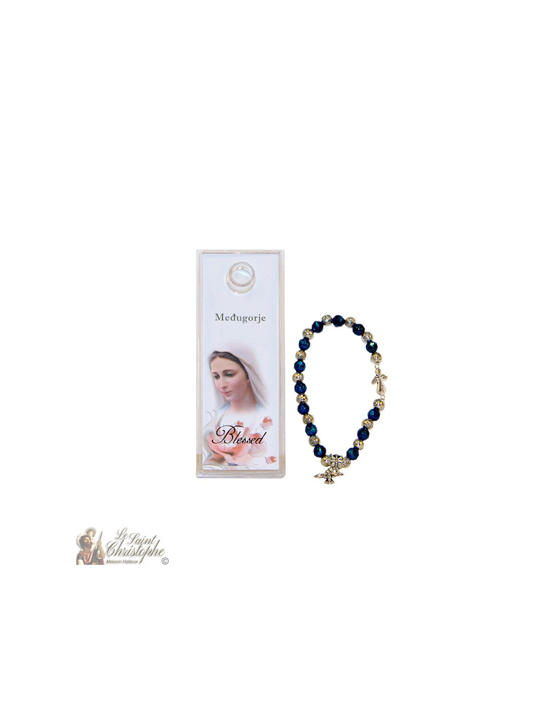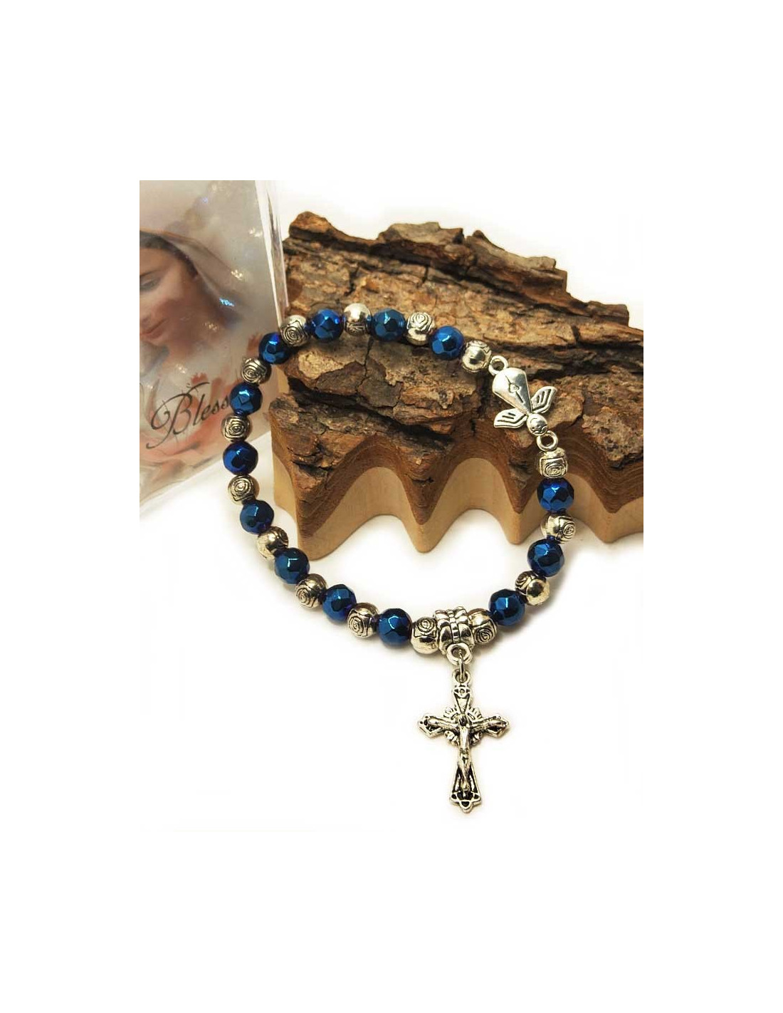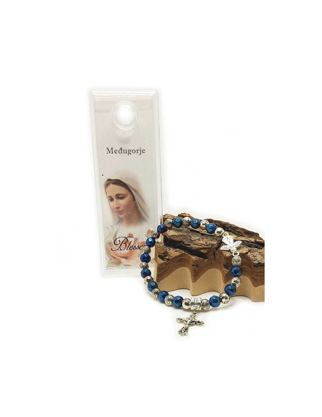 Questo braccialetto elastico, con perle lucide blu e argento tagliate a forma di rosa, è ornato da due piccoli ciondoli: un simpatico angelo decorato con un cuore e una croce con Gesù sopra. Protetto da una bella custodia trasparente, il braccialetto è corredato da un'immagine della Beata Vergine di Medjugordje. Il bracciale può essere utilizzato anche come tenainier.