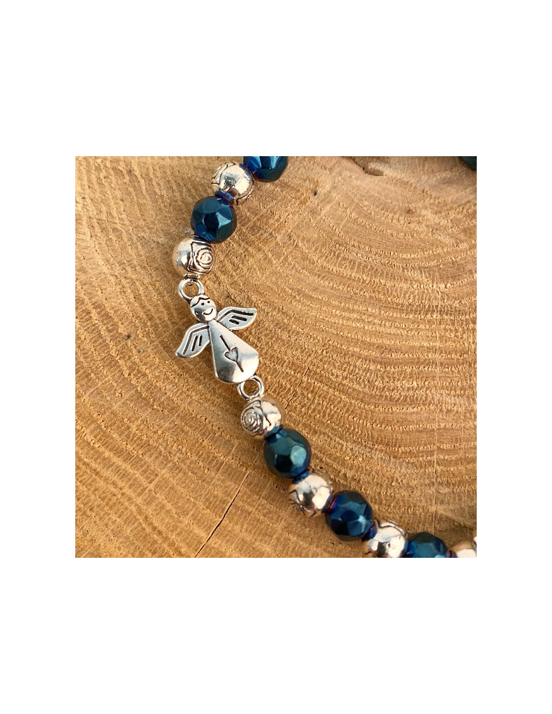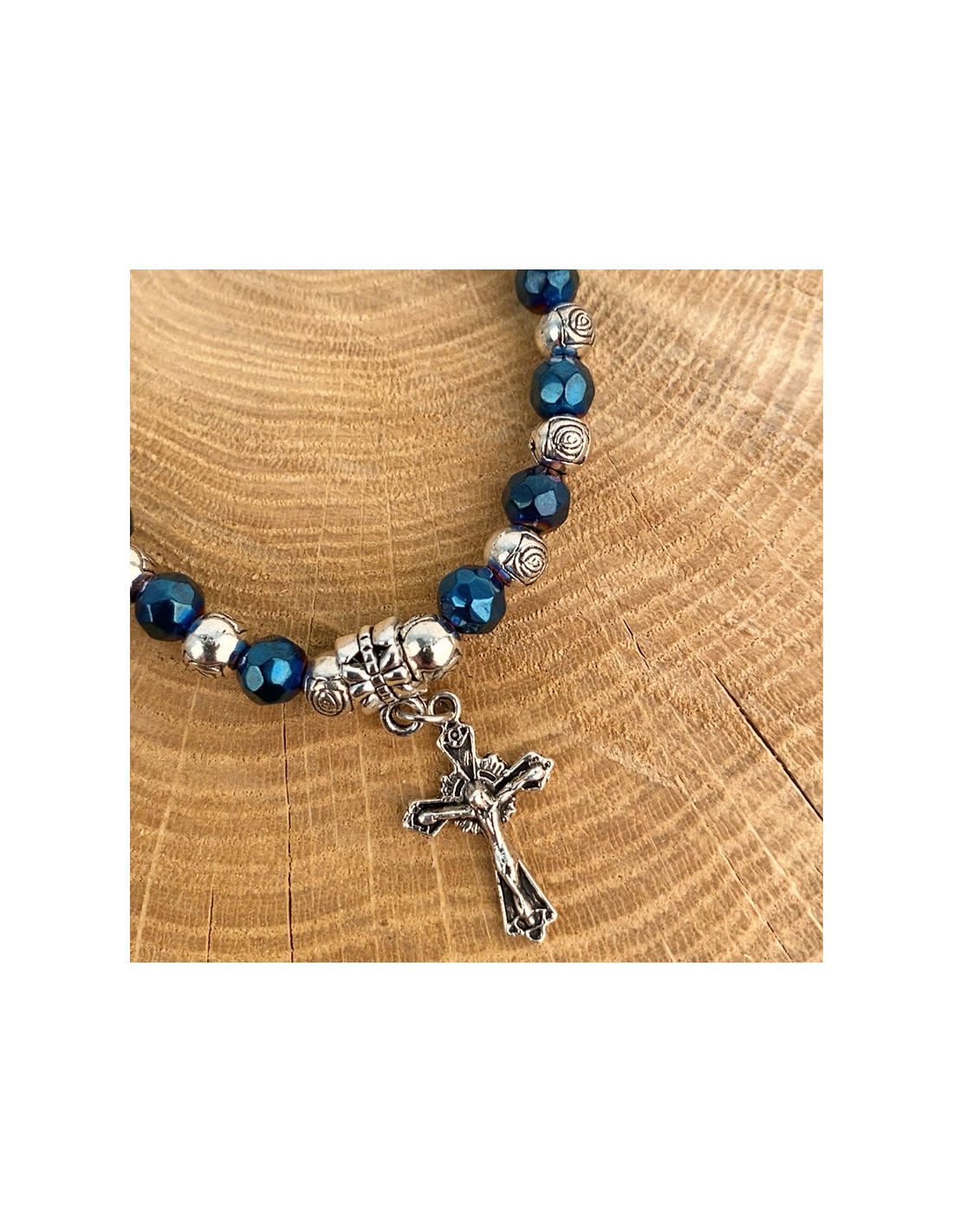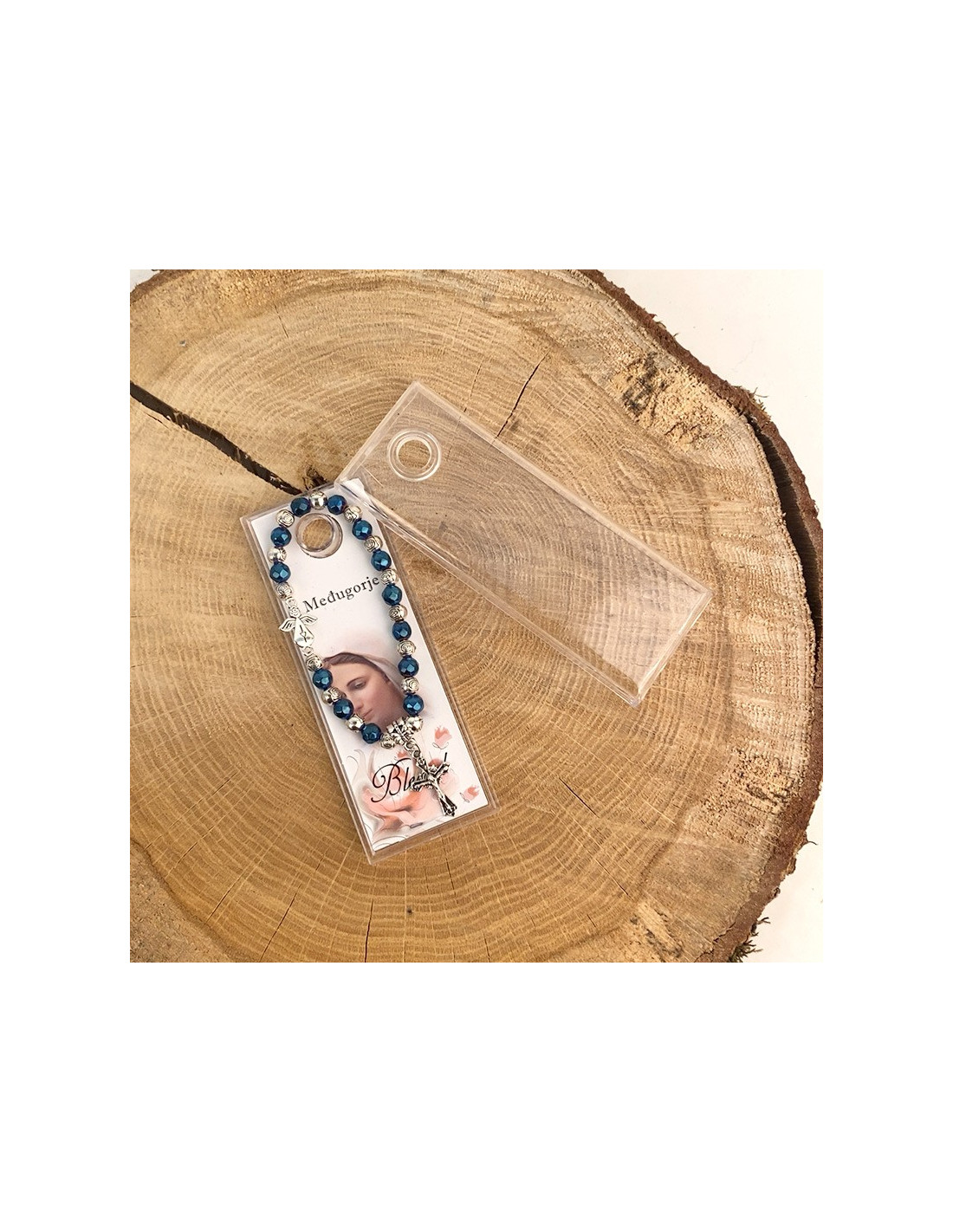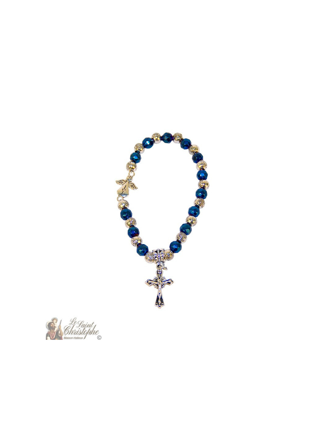 Questo braccialetto elastico, con perle lucide blu e argento tagliate a forma di rosa, è ornato da due piccoli ciondoli: un simpatico angelo decorato con un cuore e una croce con Gesù sopra. Protetto da una bella custodia trasparente, il braccialetto è corredato da un'immagine della Beata Vergine di Medjugordje. Il bracciale può essere utilizzato anche come tenainier.