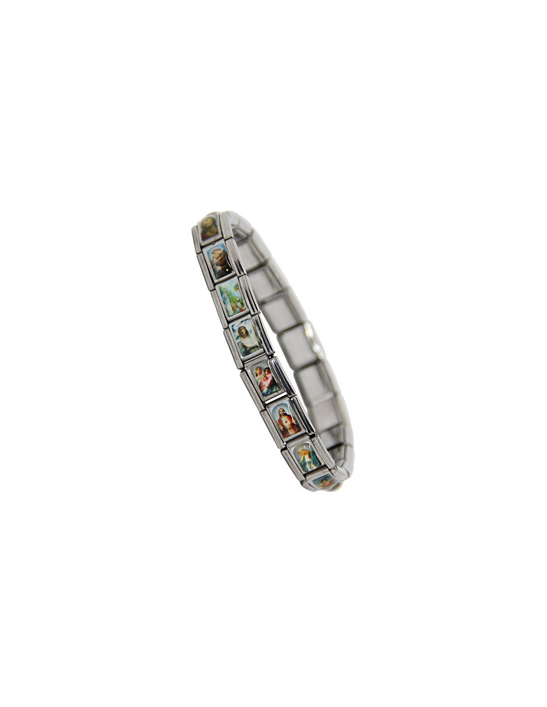 Questo braccialetto in acciaio inossidabile, di ottima qualità, ha maglie rettangolari decorate con le effigi dei Santi. Questi santi sono stati scelti giudiziosamente per le loro azioni protettive e benevole verso gli uomini. Troviamo il Sacro Cuore di Gesù, Sant'Antonio, la Vergine Miracolosa, Cristo, San Donato e molti altri!
