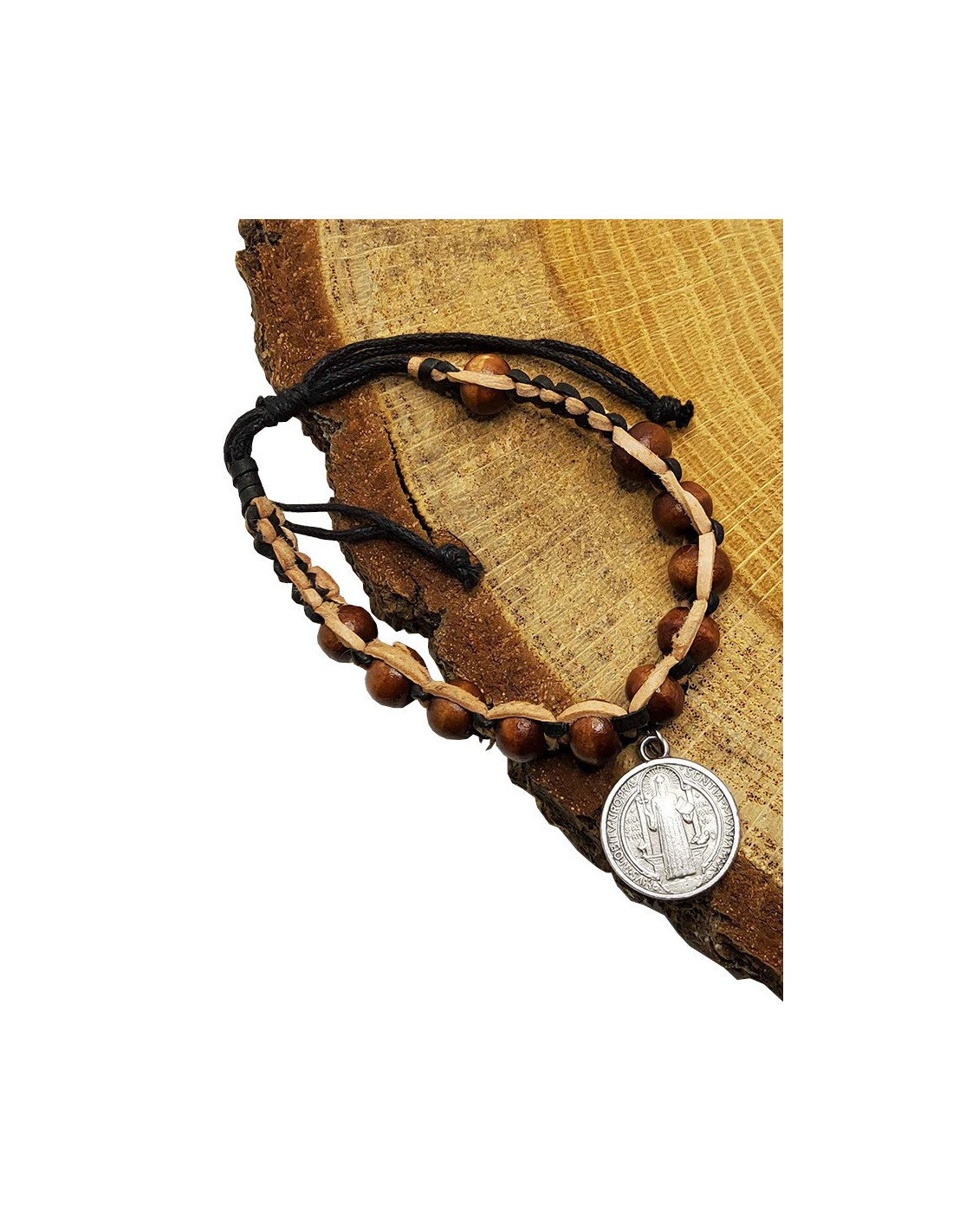 Bracciale dieci in legno e pelle marrone con medaglia di San Benedetto