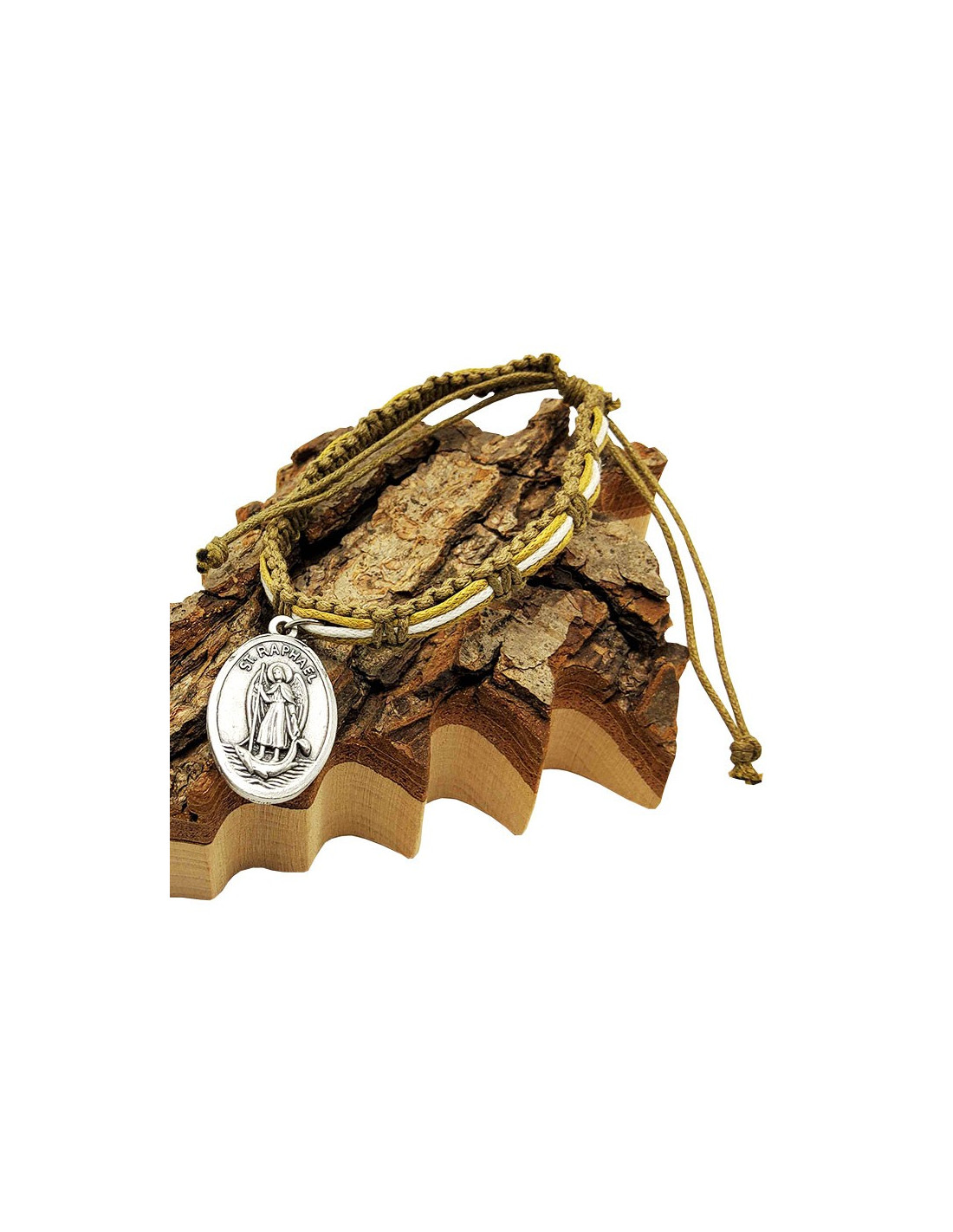 Bracciale realizzato con cordoncini intrecciati in colori naturali con medaglia in metallo fantasia dell'Arcangelo San Michele e dell'Arcangelo San Raffaele. I cordoncini sono color kaki, giallo kaki e bianco. È un mix naturale, quasi bohémien, che si abbina facilmente a tutto.