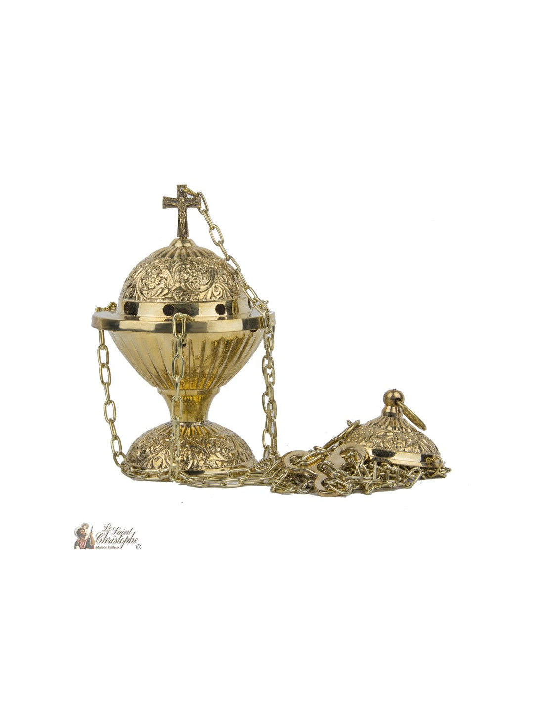 Questo incensiere in rame dorato è progettato per essere appeso o posizionato secondo le vostre esigenze grazie alle catene. È un accessorio perfetto per cerimonie e celebrazioni religiose come le messe. Il suo design delicato è finemente lavorato con un fregio floreale sulla sua superficie. È decorato con una croce con la figura di Cristo. Questo articolo è stato lavorato a mano.