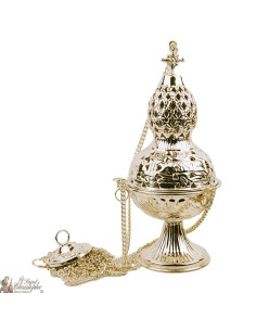 Bellissimo incensiere in rame con sfumature dorate, è stato realizzato interamente a mano. Si compone di 3 parti: manico, coperchio incernierato e griglia interna per carbonella piccola o grande. Il turibolo è sormontato da una croce, i fori sono inclusi in un bellissimo affresco inciso e anche il piede è scolpito.