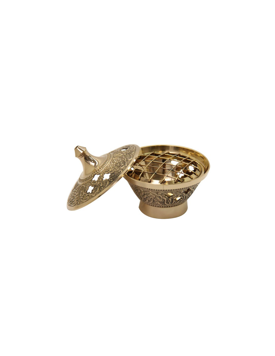 Questo incensiere, con coperchio e griglia interna, è stato lavorato interamente a mano. L'incensiere è coperto da due bei fregi floreali. La griglia, dove si deposita l'incenso, è rimovibile per permettere un uso e una pulizia più facili.