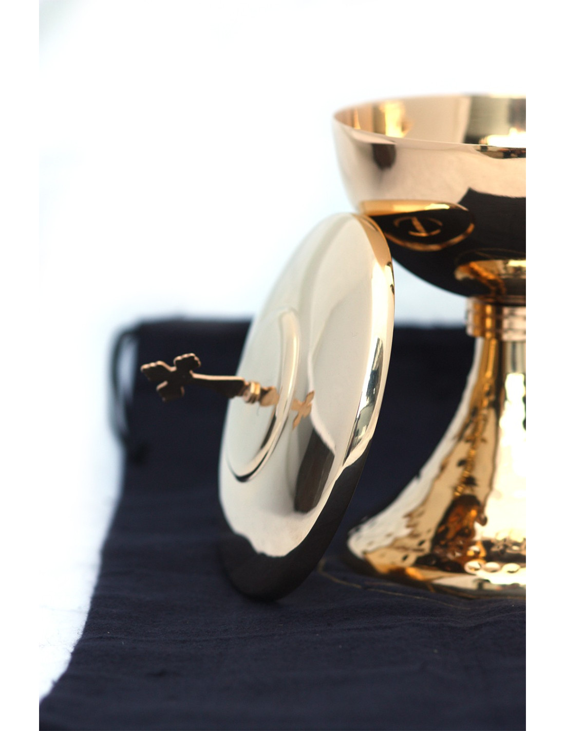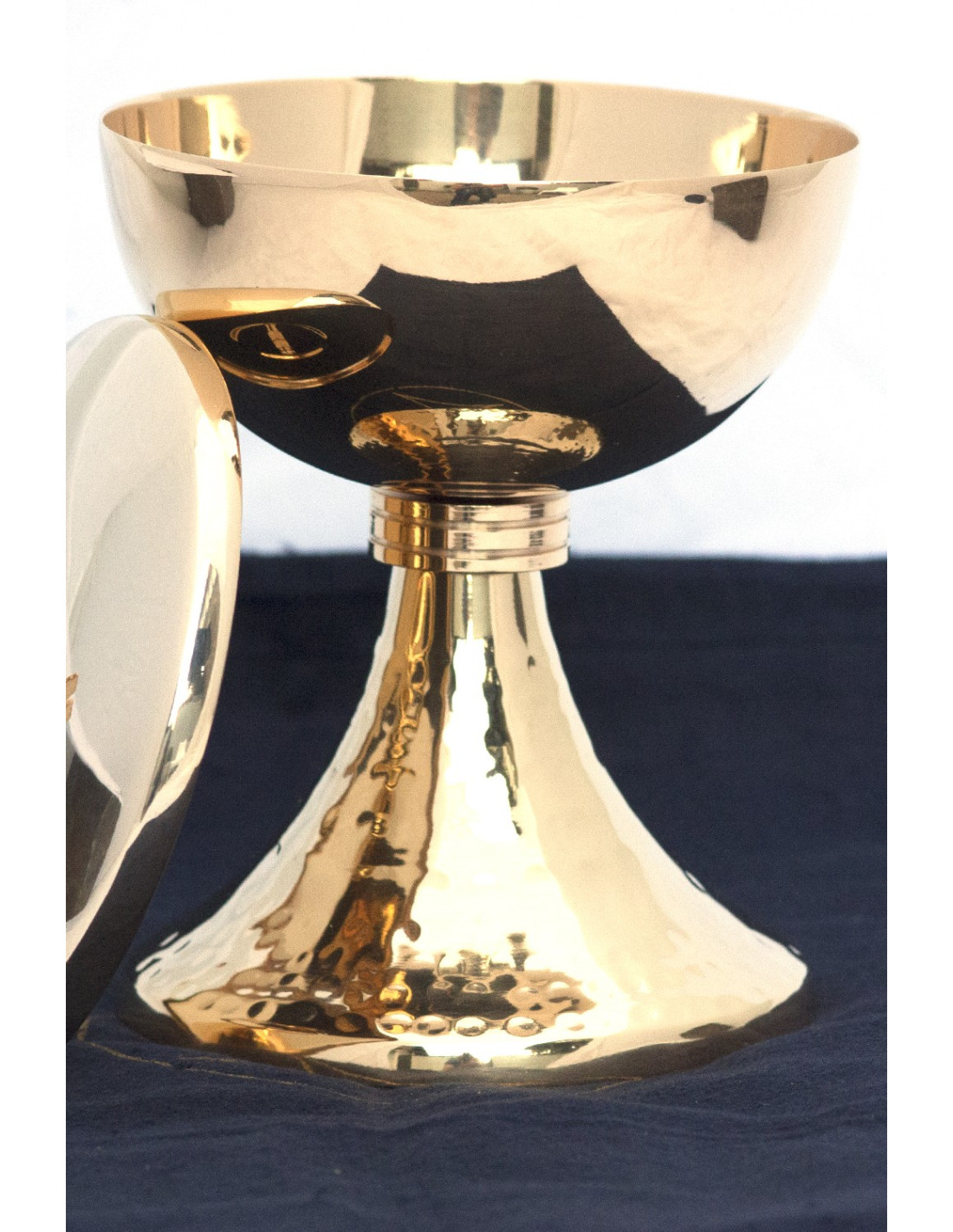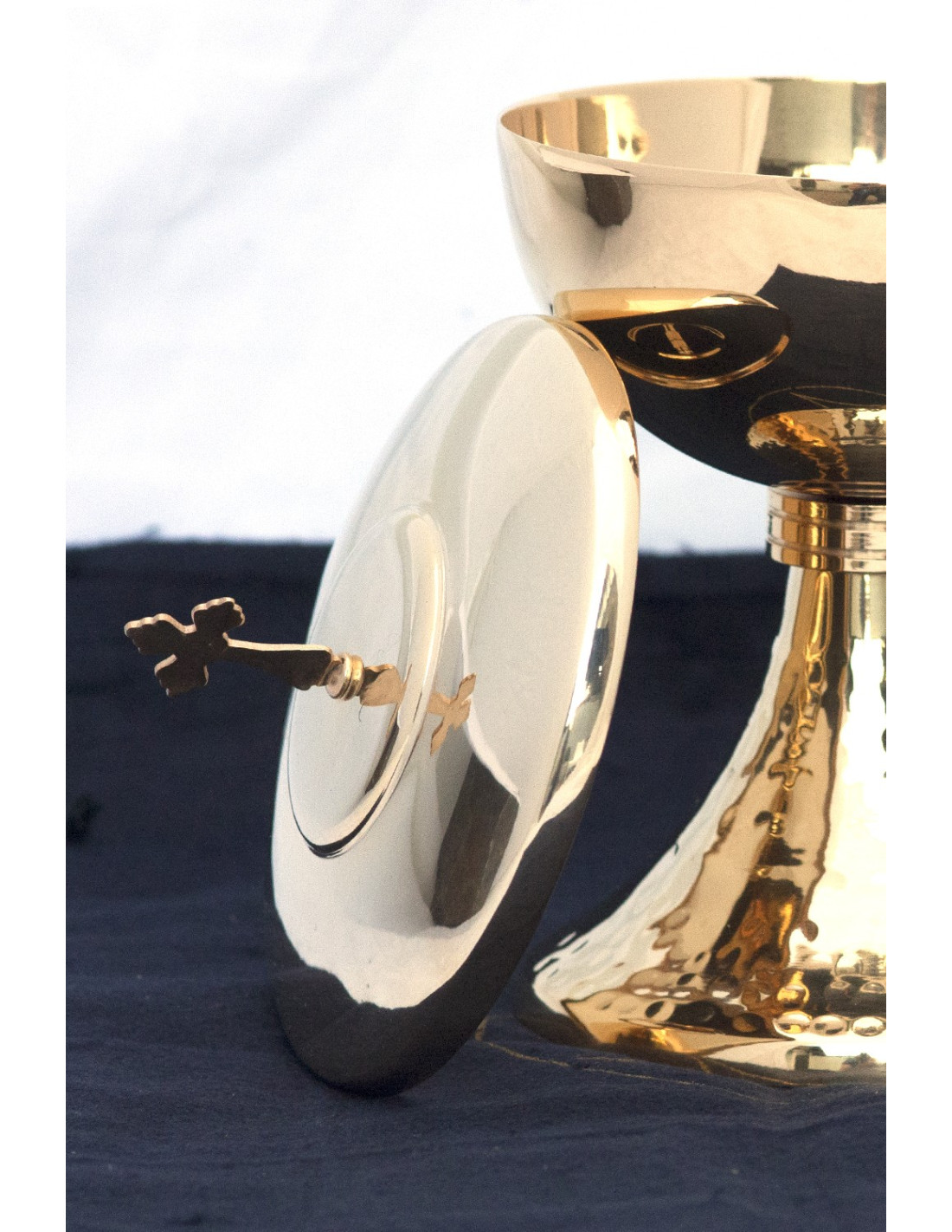 Rendete più solenni le vostre celebrazioni liturgiche con questo raffinato ciborio in rame dorato. La base delicatamente martellata gli conferisce un’eleganza unica, mentre il coperchio sormontato da una croce richiama la solennità della Presenza Eucaristica.