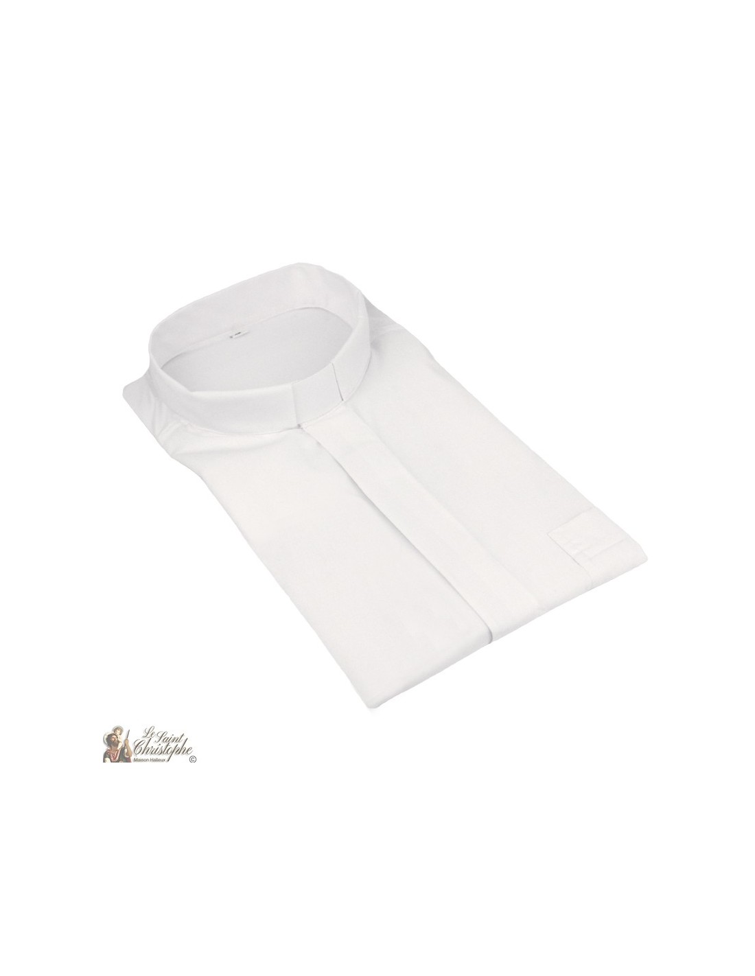 Camicia con colletto romano per il sacerdote. Questo modello è bianco con maniche lunghe, tasche frontali, tessuto misto poliestere e cotone. Lavabile in lavatrice.