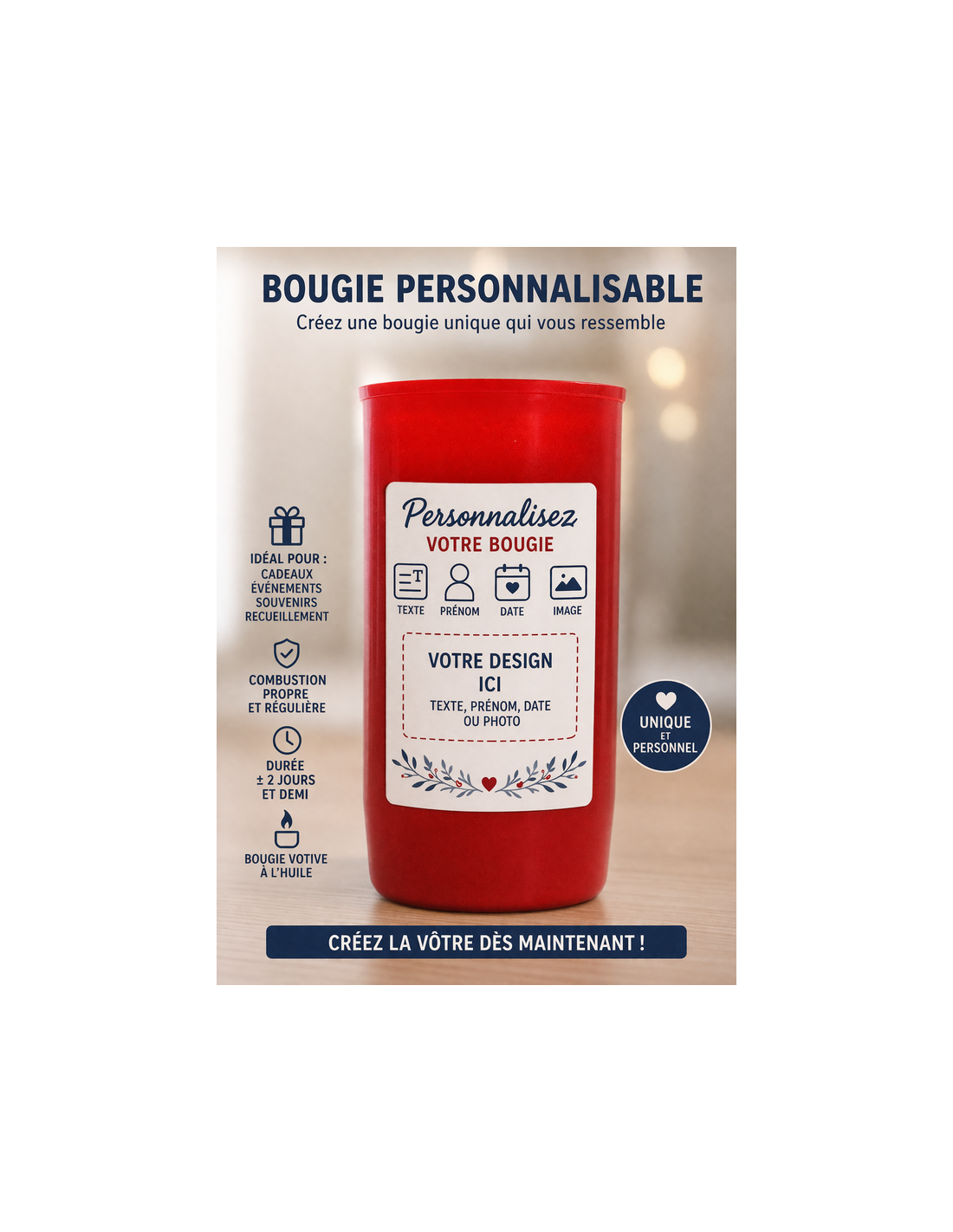 Questa candela votiva personalizzabile è ideale per preghiera, ricordo o eventi speciali. Può essere personalizzata con testo, nome, data o immagine.
