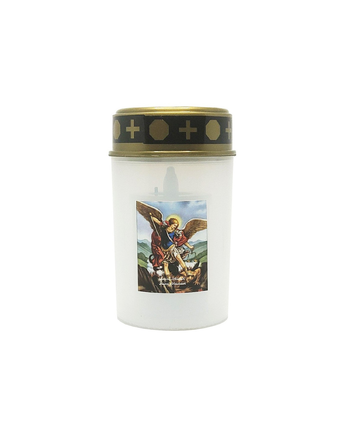 Questa candela LED è decorata con l'immagine di San Michele Arcangelo, un potente simbolo di protezione contro le forze del male.
