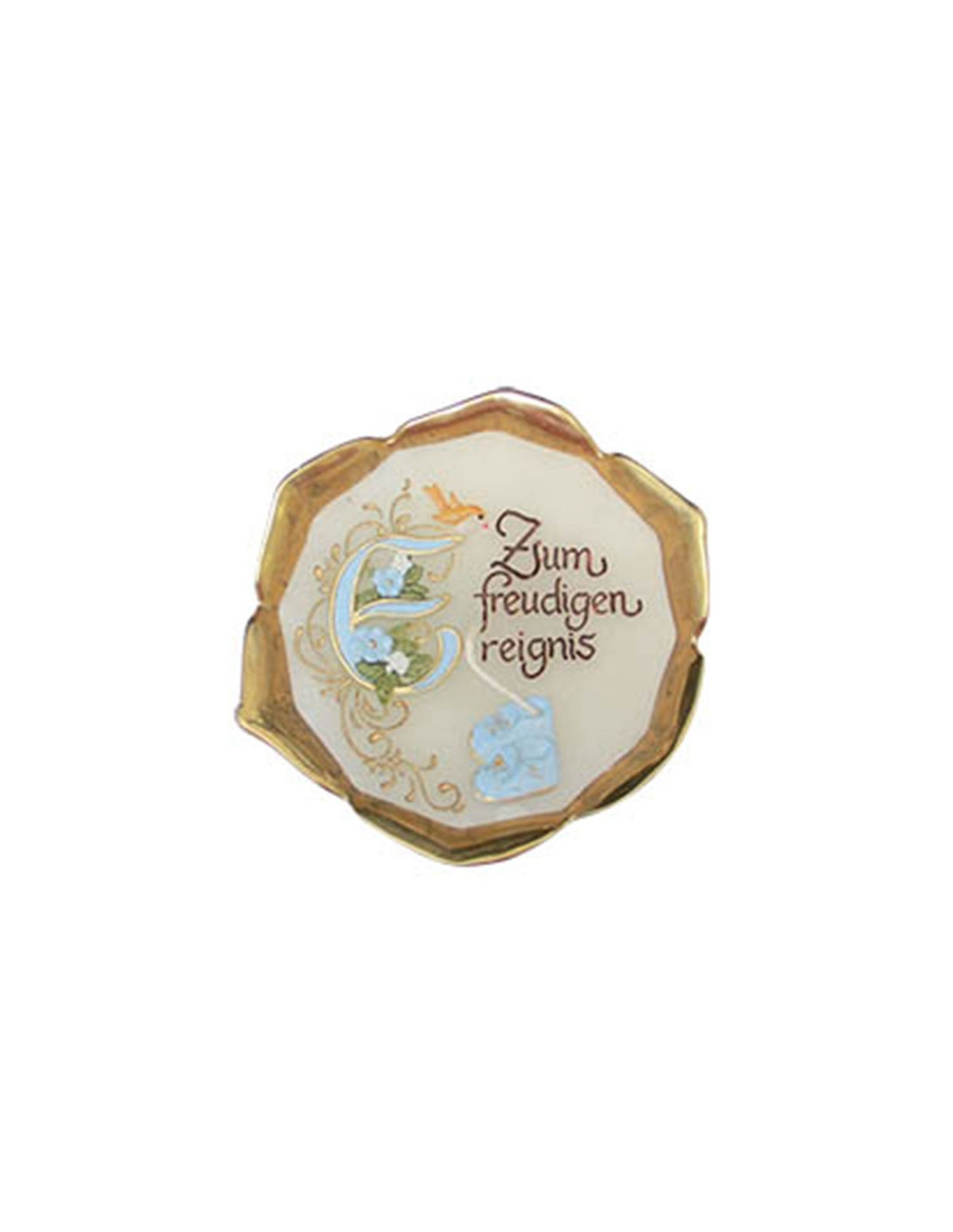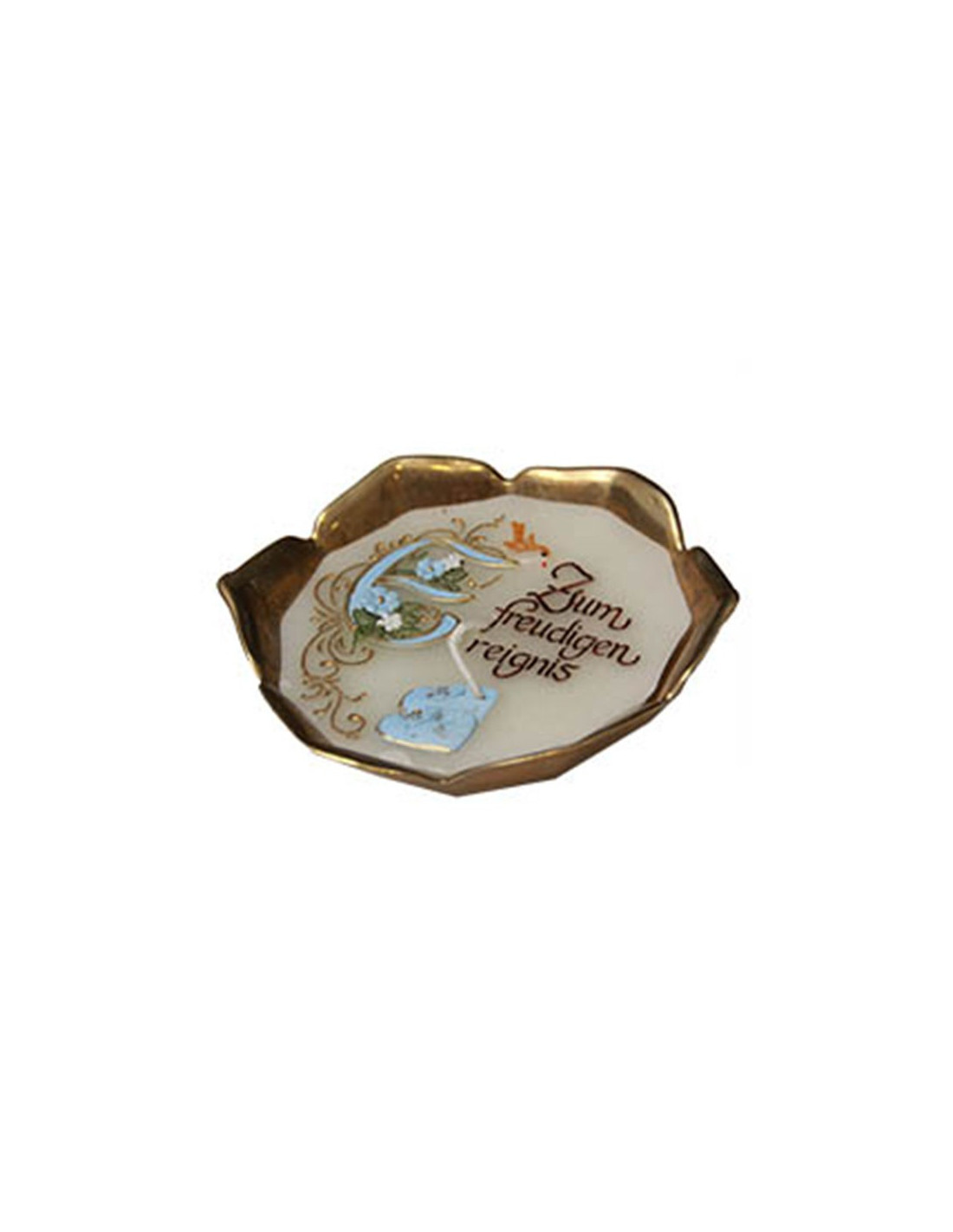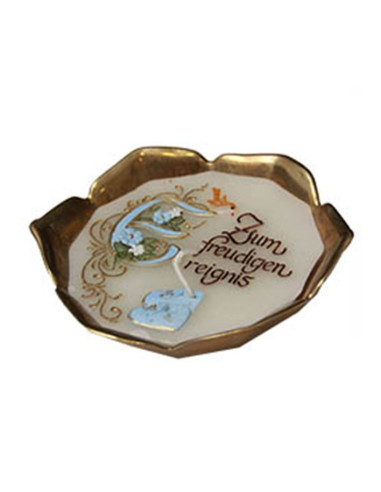 Ideale per un battesimo o una nascita, questa candela artigianale è fusa in una bella ciotola di ottone a forma di fiore. La cera è incisa, scolpita e dipinta con la frase calligrafica “per il lieto evento” in tedesco e piccole scarpette blu.