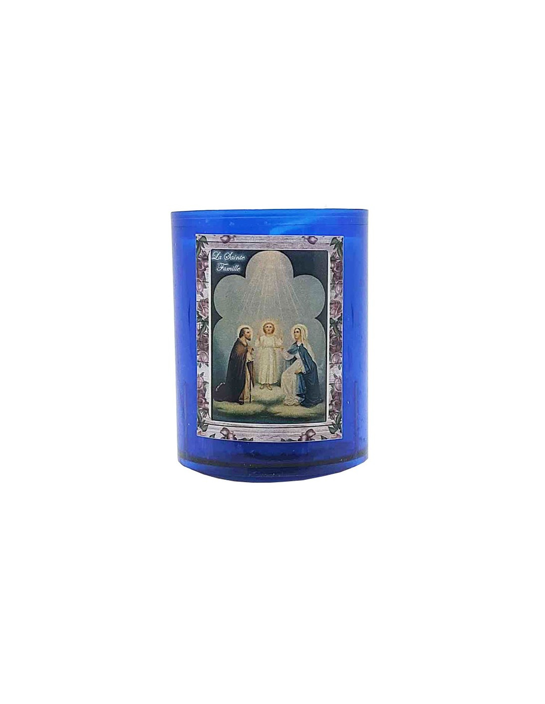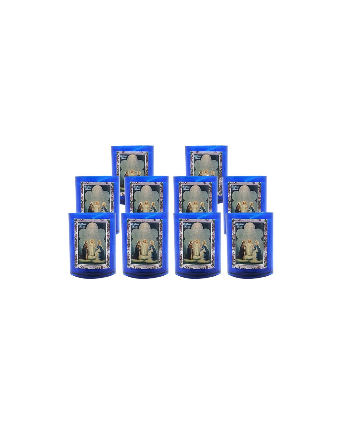 Candele notturne blu con l'immagine della Sacra Famiglia. Vendute in confezione da 10 pezzi.