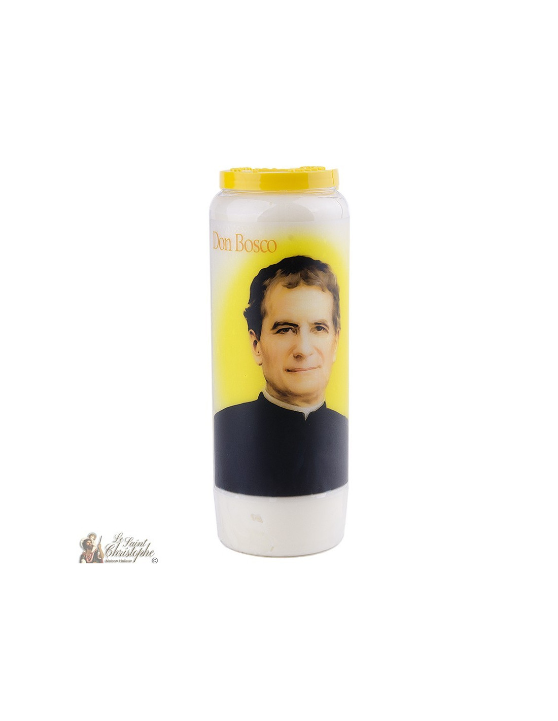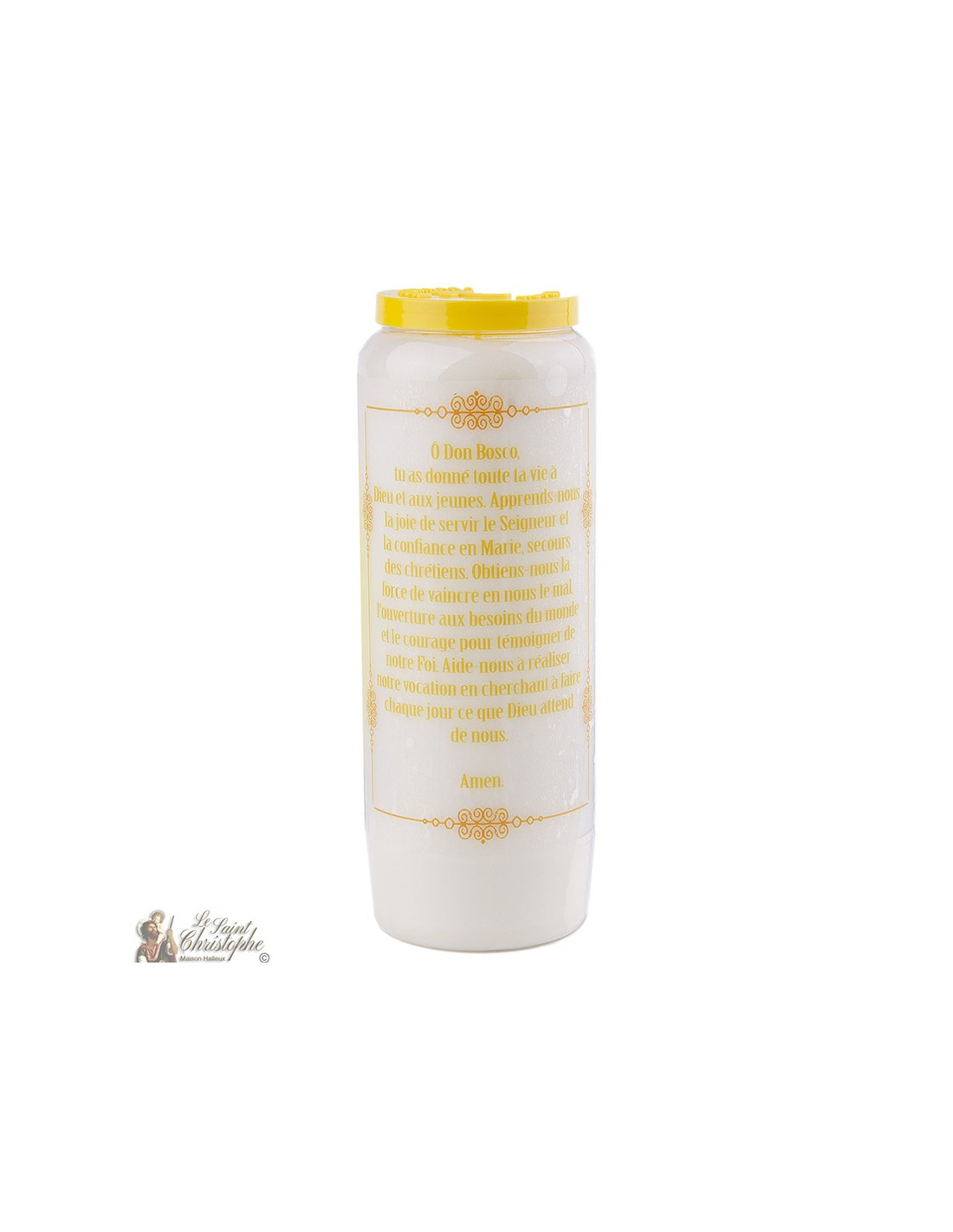Candela della novena con l'immagine di Don Bosco sul fronte e una preghiera a lui dedicata sul retro.