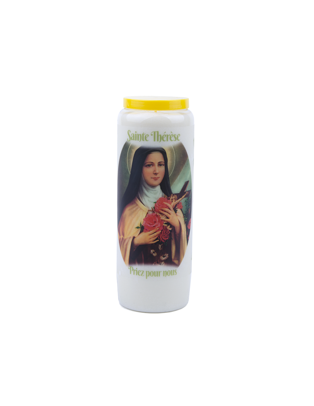 Candela della novena con immagine di Santa Teresa e preghiera a lei dedicata sul retro.