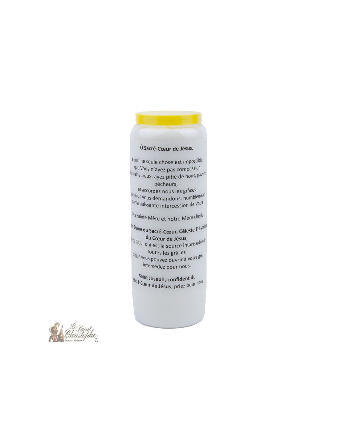 Candela bianca della novena con l'immagine del Sacro Cuore di Gesù e Maria e una preghiera a loro dedicata.