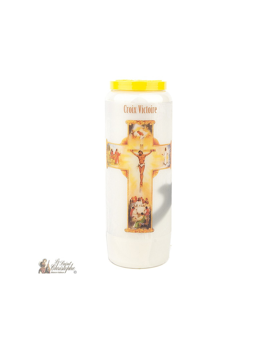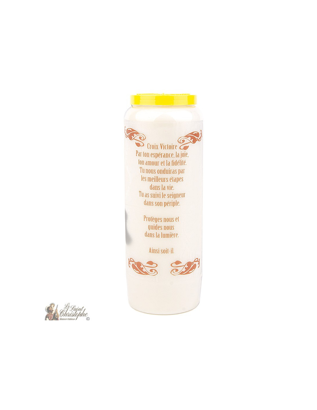 Cero della novena con immagine della Croce della Vittoria e preghiera sul retro.
