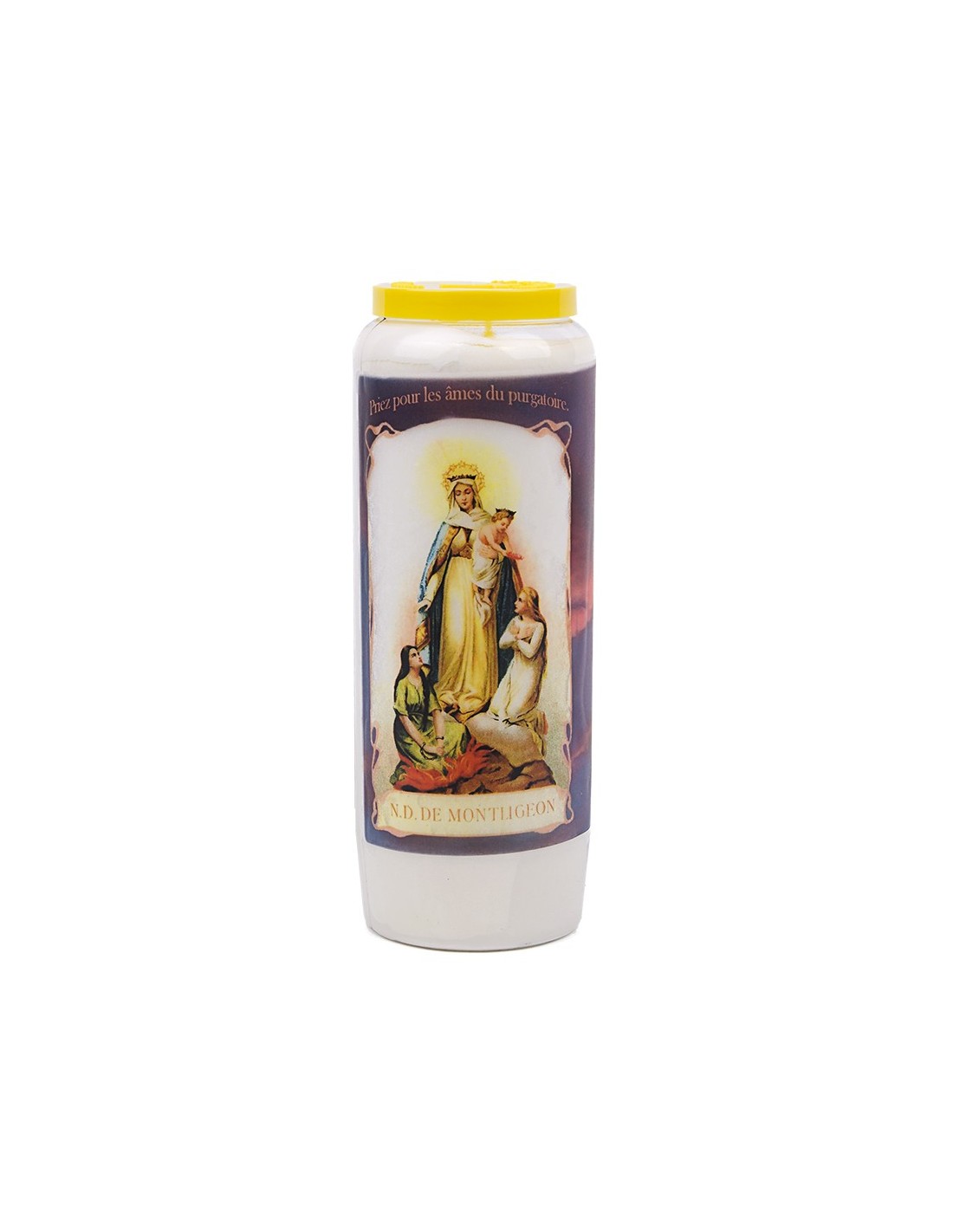 Candela novena con l'immagine della Madonna di Montligeon e la preghiera sul retro.
