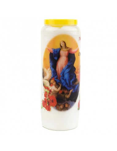 Candela della Novena con l'immagine della Madonna Assunta e preghiera sul retro.