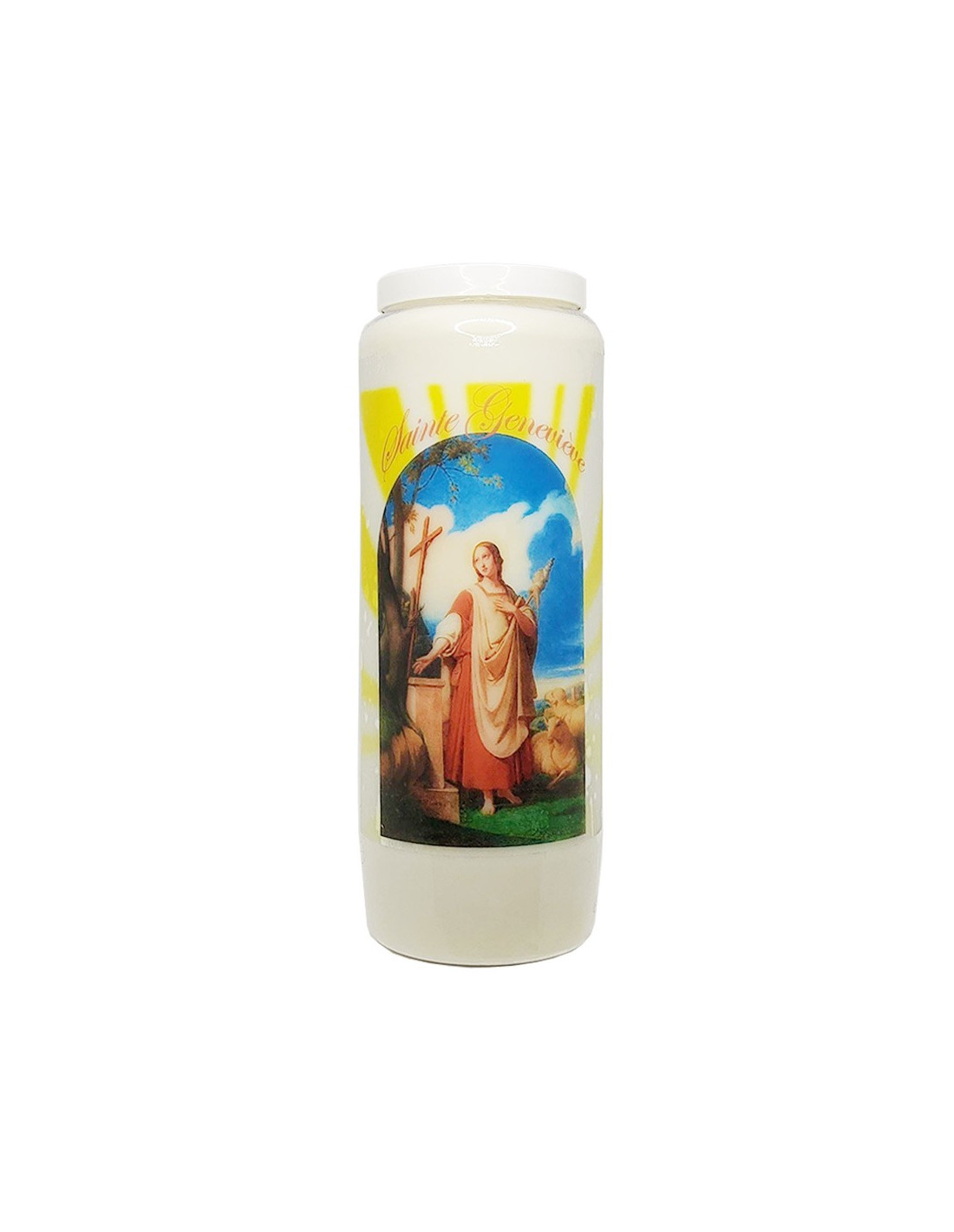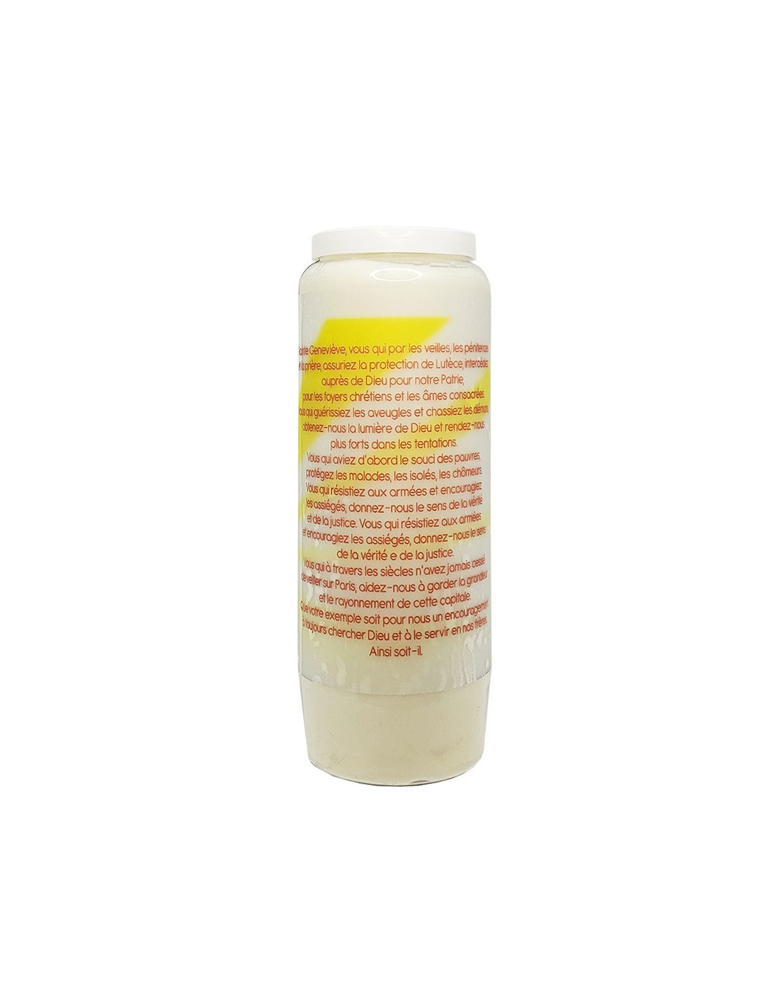 Candela della novena con l'immagine di Sainte Geneviève sul fronte e la preghiera sul retro.