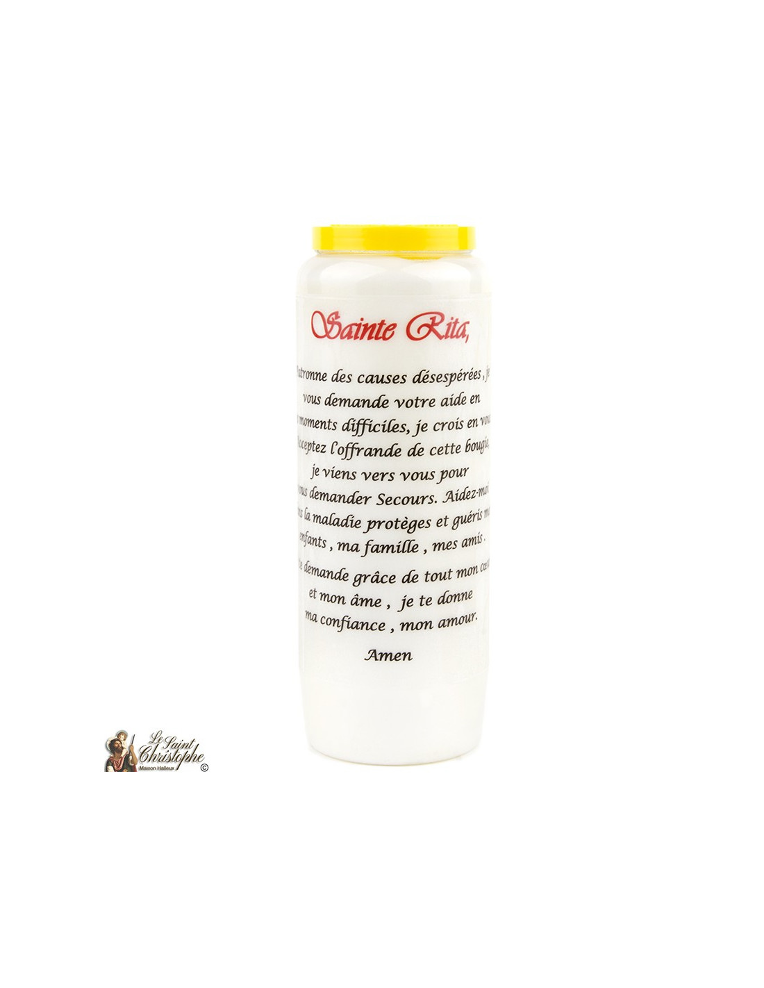 Candela novena con immagine di Santa Rita e preghiera sul retro.