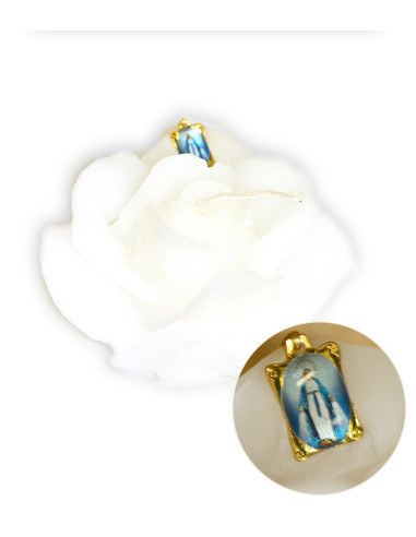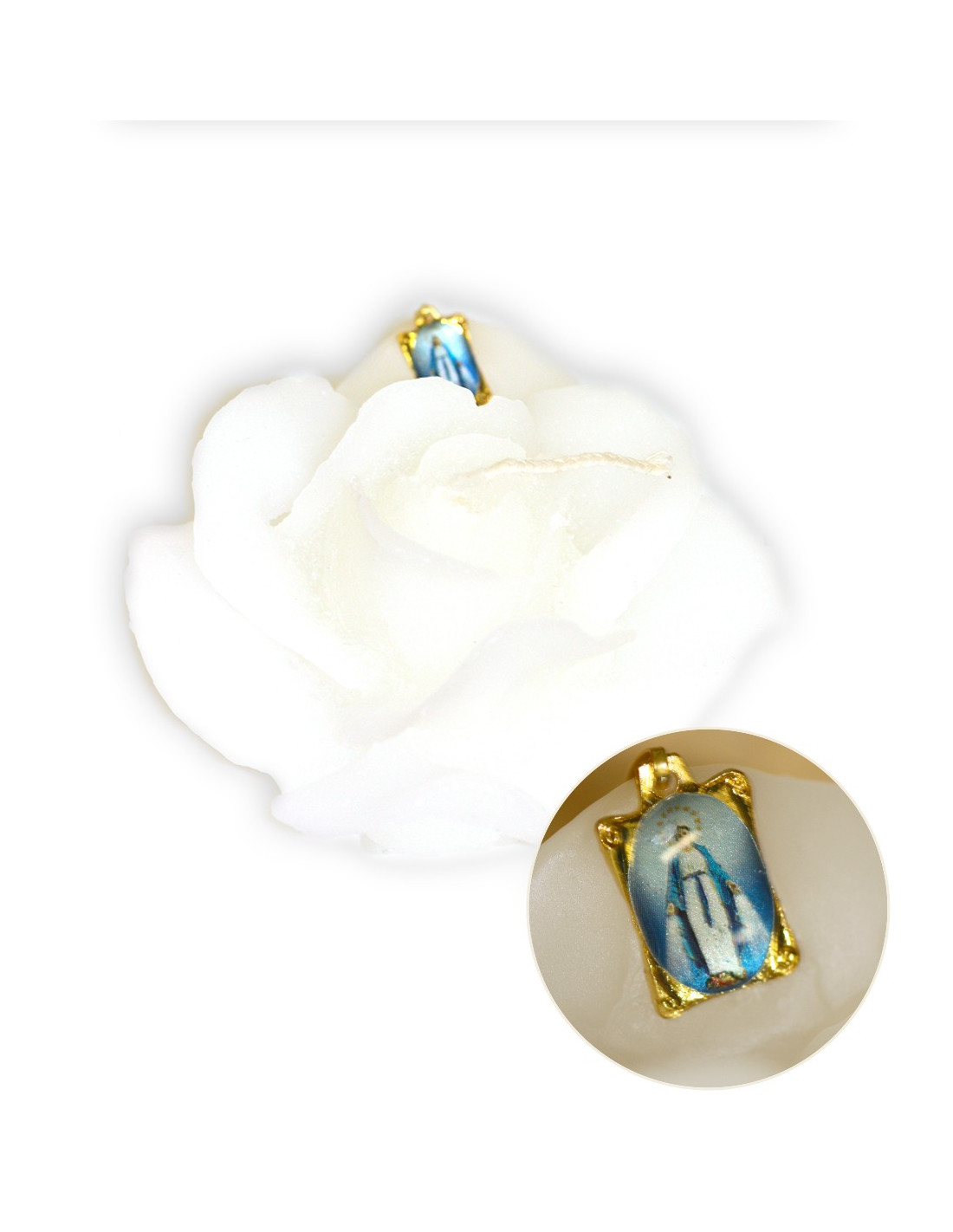 Candela con rose rosse e spilla della Vergine Miracolosa
