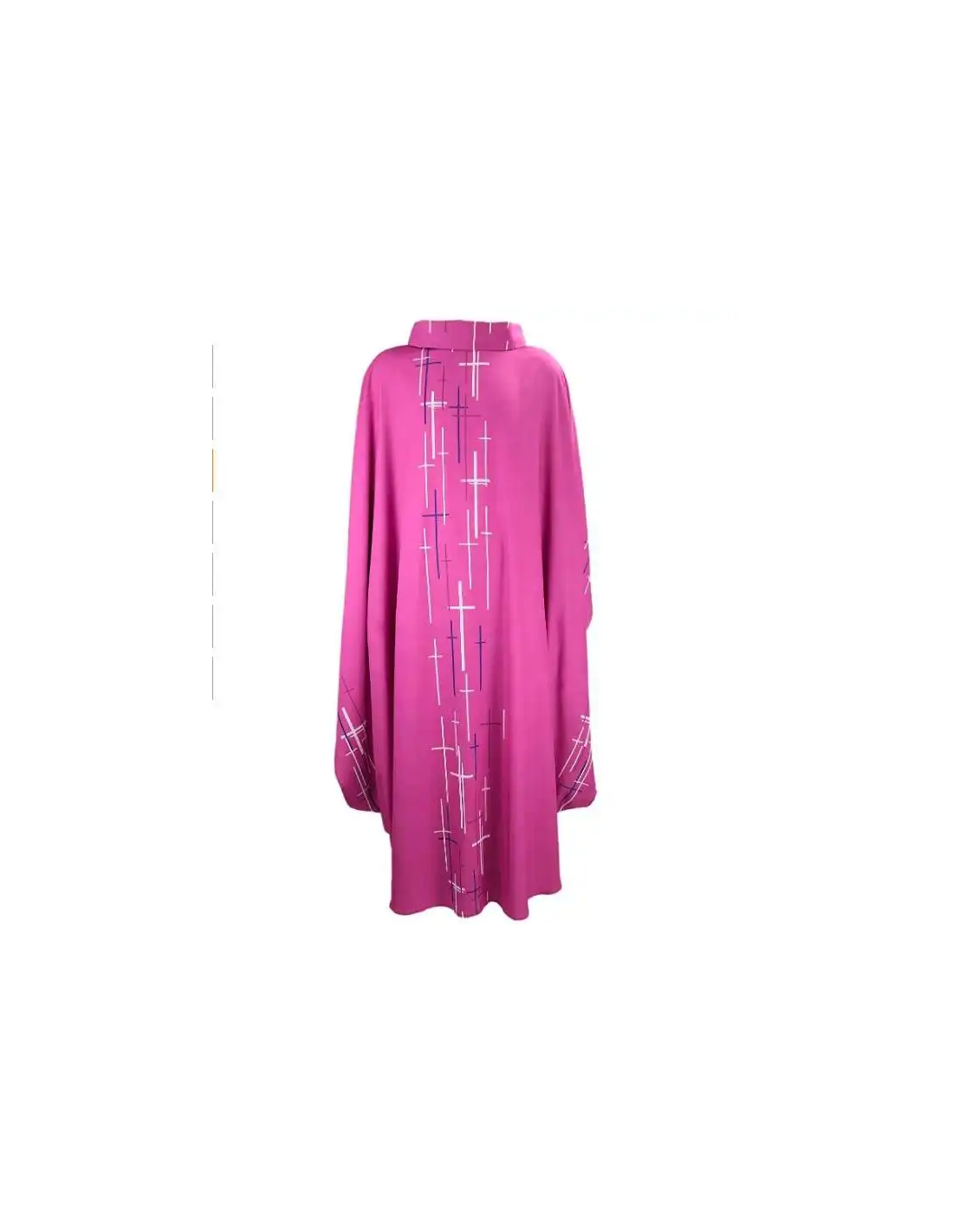 Casula da prete viola con un motivo sobrio e moderno sul davanti, sul retro e sulle maniche: una moltitudine di croci bianche e viola sovrapposte. Il tessuto è fluido e arioso, molto leggero da indossare. Materiale: 97% poliestere, 3% spandex Lunghezza: 130,5 cm