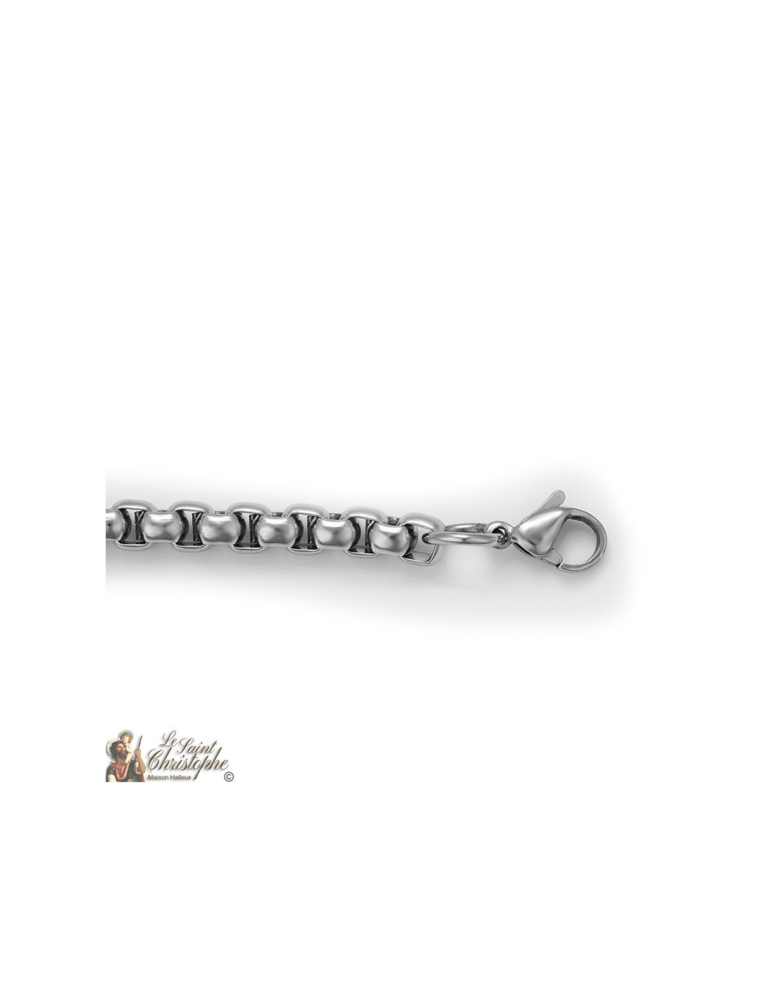 Catena in acciaio inossidabile, argento lucido, con maglie spesse leggermente quadrate per uno stile moderno.