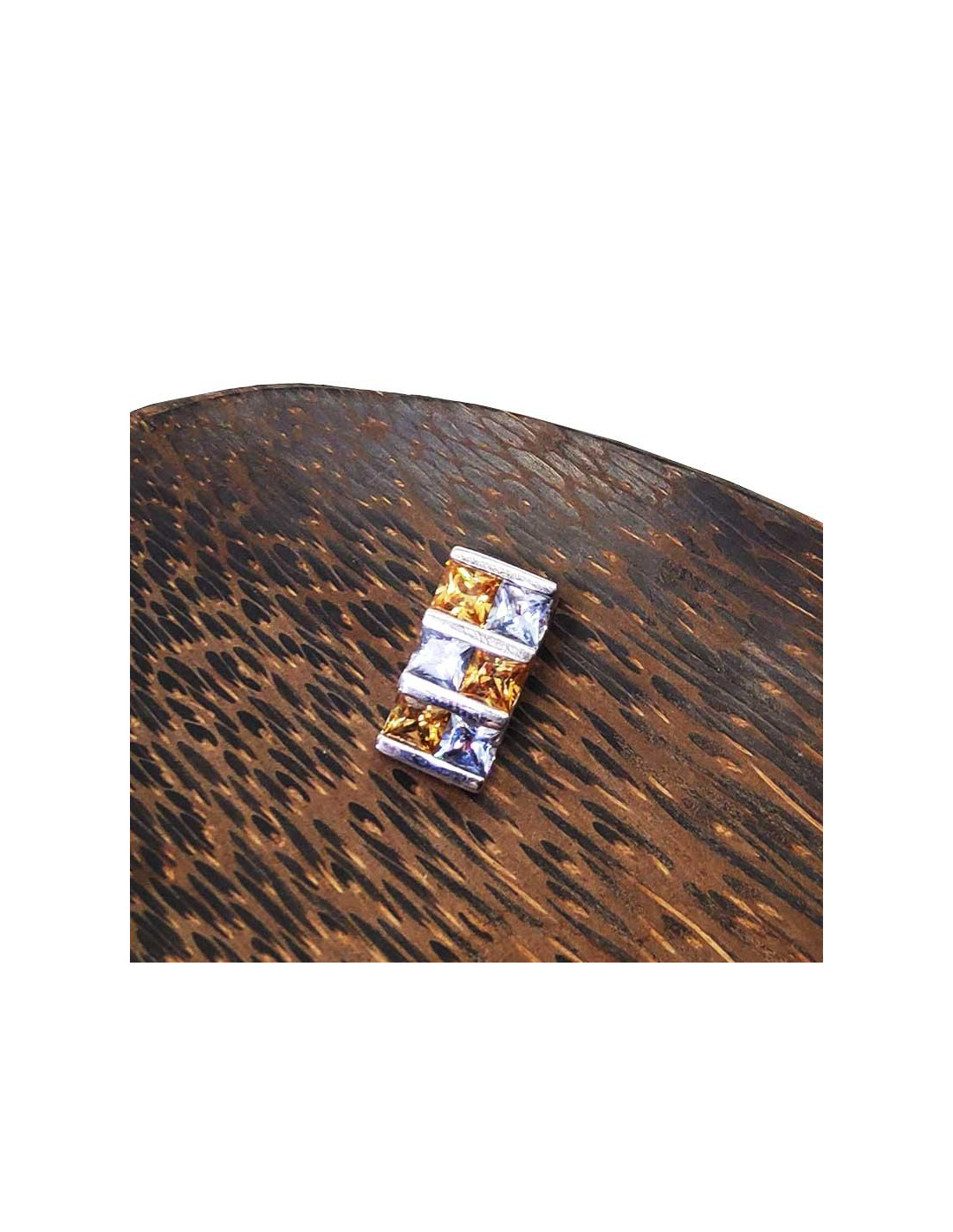 Questo ciondolo è impreziosito da 6 cristalli scintillanti, accuratamente disposti su tre file da due. La combinazione di cristalli blu cielo e arancio oro crea un contrasto sorprendente e aggiunge un tocco di colore vibrante a questo raffinato gioiello. Quando viene indossato, il ciondolo si inclina leggermente in avanti, creando un effetto visivo dinamico e contemporaneo.