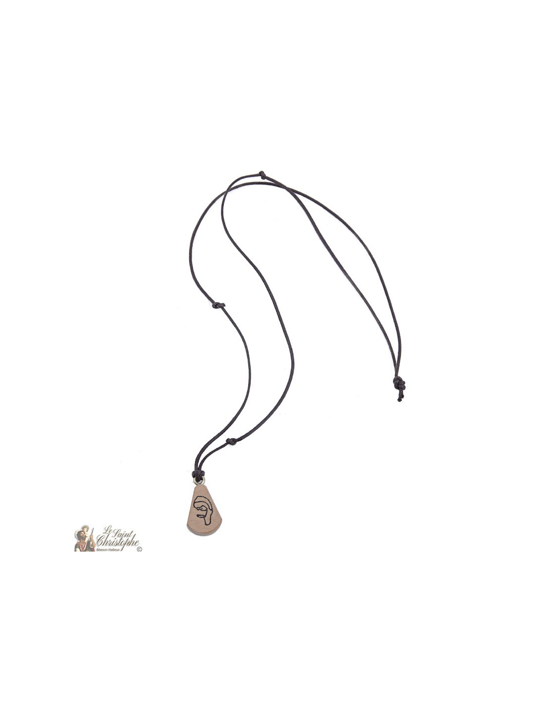 Collana con cordoncino regolabile per bambini o adulti. Sul pendente è incisa la figura della Vergine Maria, realizzata a mano in legno d'ulivo.