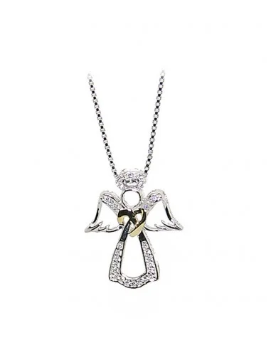 Collana con catena in argento 925 con maglie quadrate e pendente angelo. Questo piccolo angelo custode argenteo dalle forme pure e morbide è intarsiato con cristalli e zirconi, il suo cuore lucido è tinto d'oro.