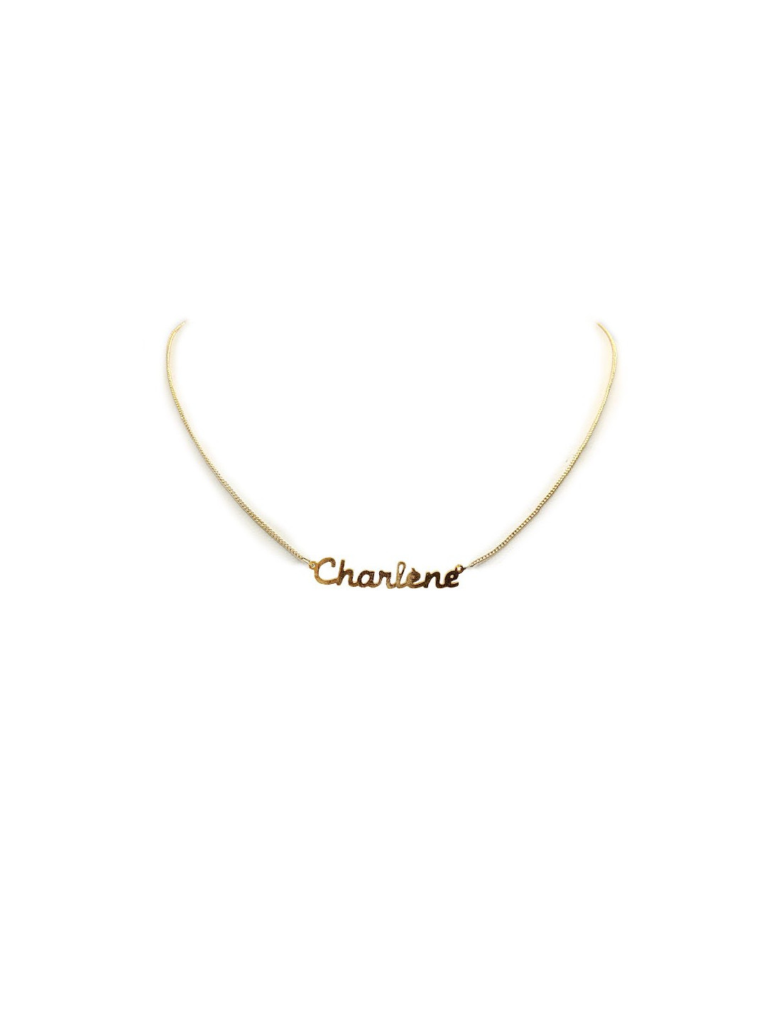 Mostra il tuo nome o quello di una persona cara con questa collana girocollo placcata oro. Il nome "Charlène", in eleganti lettere placcate oro, è incastonato su una catenina in metallo placcato oro. Derivato da Charles, questo nome evoca forza gentile, determinazione silenziosa e fascino naturale. Questo raffinato gioiello è un'idea regalo delicata, perfetta per un compleanno, un anniversario o un'occasione speciale.