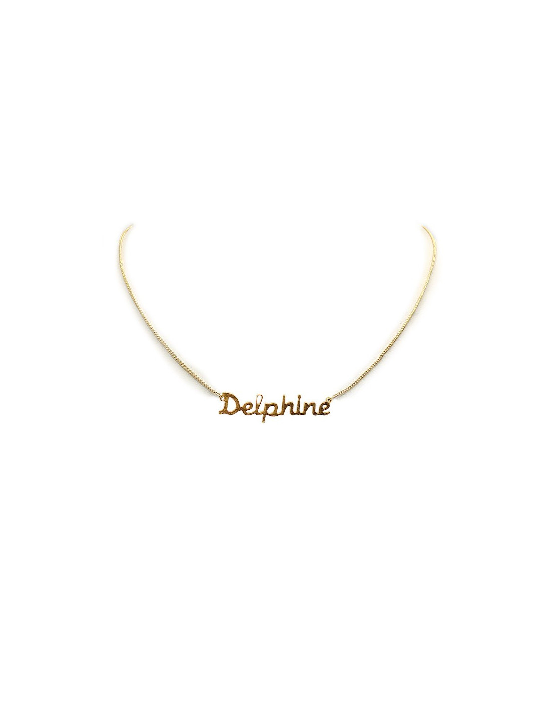 Sfoggiate il vostro nome o quello di una persona cara con questo girocollo d'oro. Il nome “Delphine”, a caratteri cubitali, è dorato in oro fino su una catenina in metallo placcato oro. Di origine greca, Delphine significa “donna di Delfi” o si riferisce al delfino. Suggerisce intuizione, eleganza e libertà. Questo raffinato gioiello è un'ottima idea regalo per un compleanno, un anniversario o un'occasione speciale.