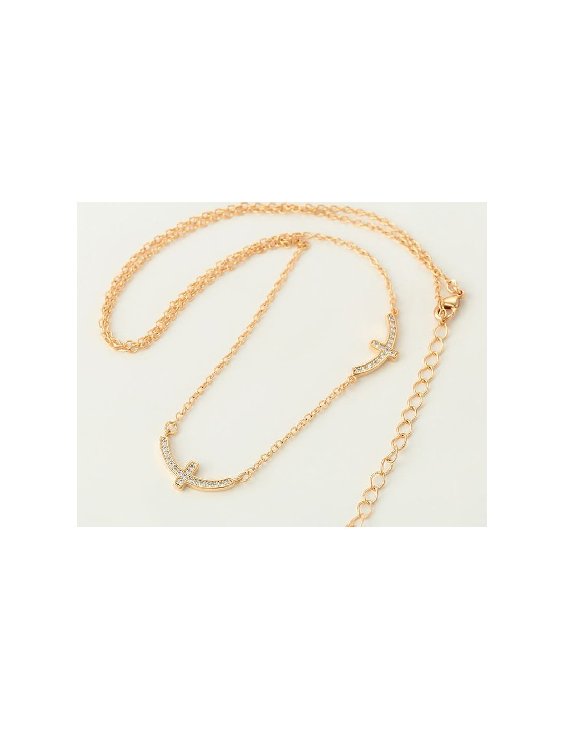 Collana in rame placcato oro 18 carati con due pendenti. I pendenti sono due croci, integrate nella catena. Sono intarsiati con cristalli sintetici di Swarovski (CZ). Le croci sono curve per dare un bell'effetto di tendenza.