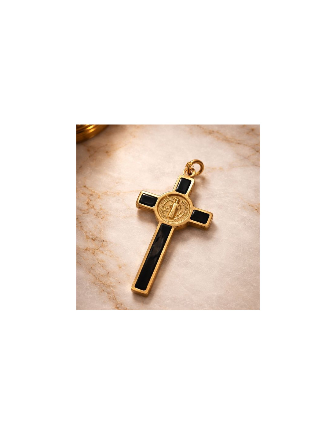 Questa elegante croce di San Benedetto in metallo dorato è impreziosita da smalto nero, che crea un raffinato contrasto con la finitura dorata lucida.
