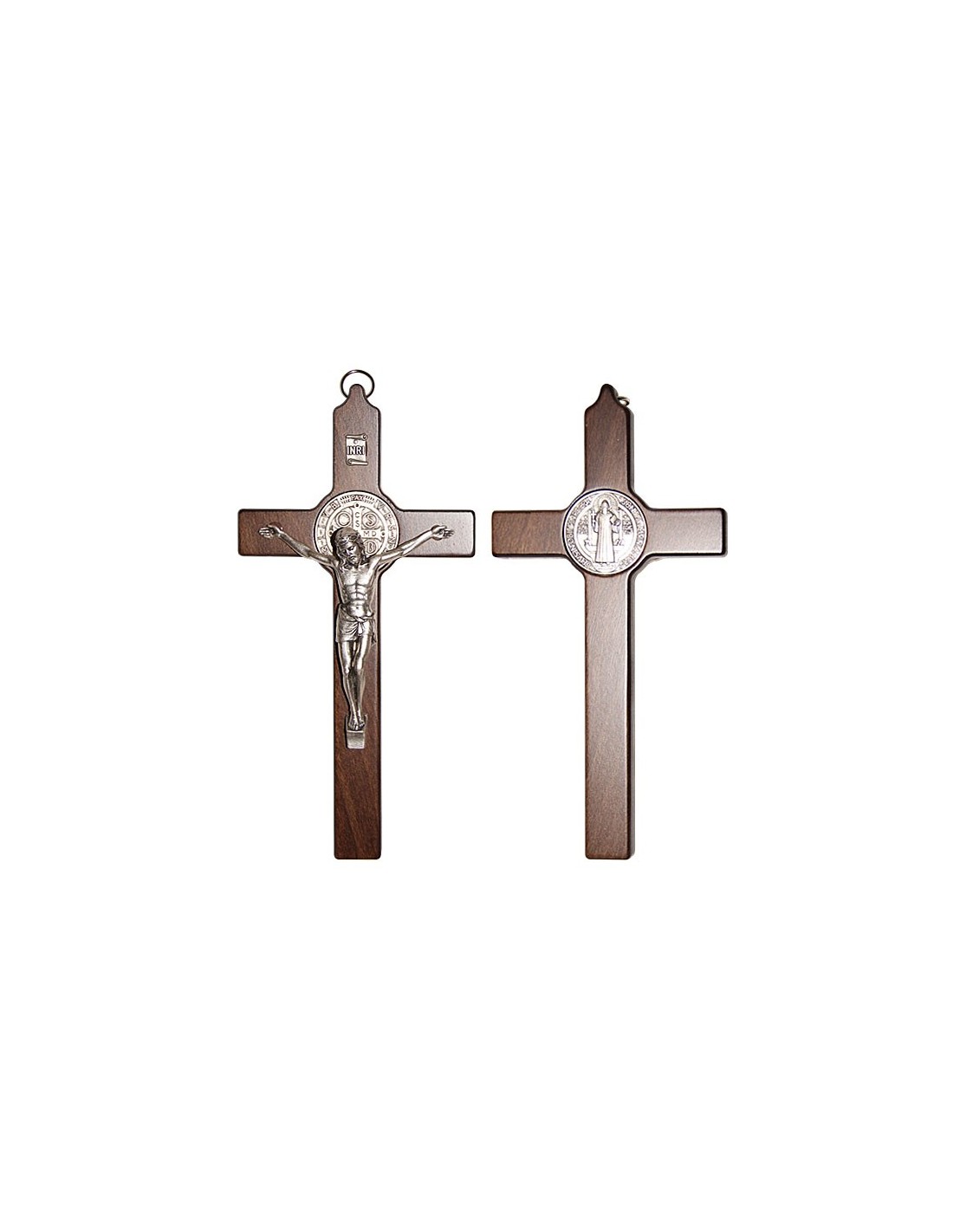 Croce da parete in legno scuro con curve semplici e sobrie. L'effigie di Gesù Cristo e la medaglia di San Benedetto, finemente scolpite, sono in metallo argentato. Questo crocifisso appeso ha anche un valore protettivo contro il male.