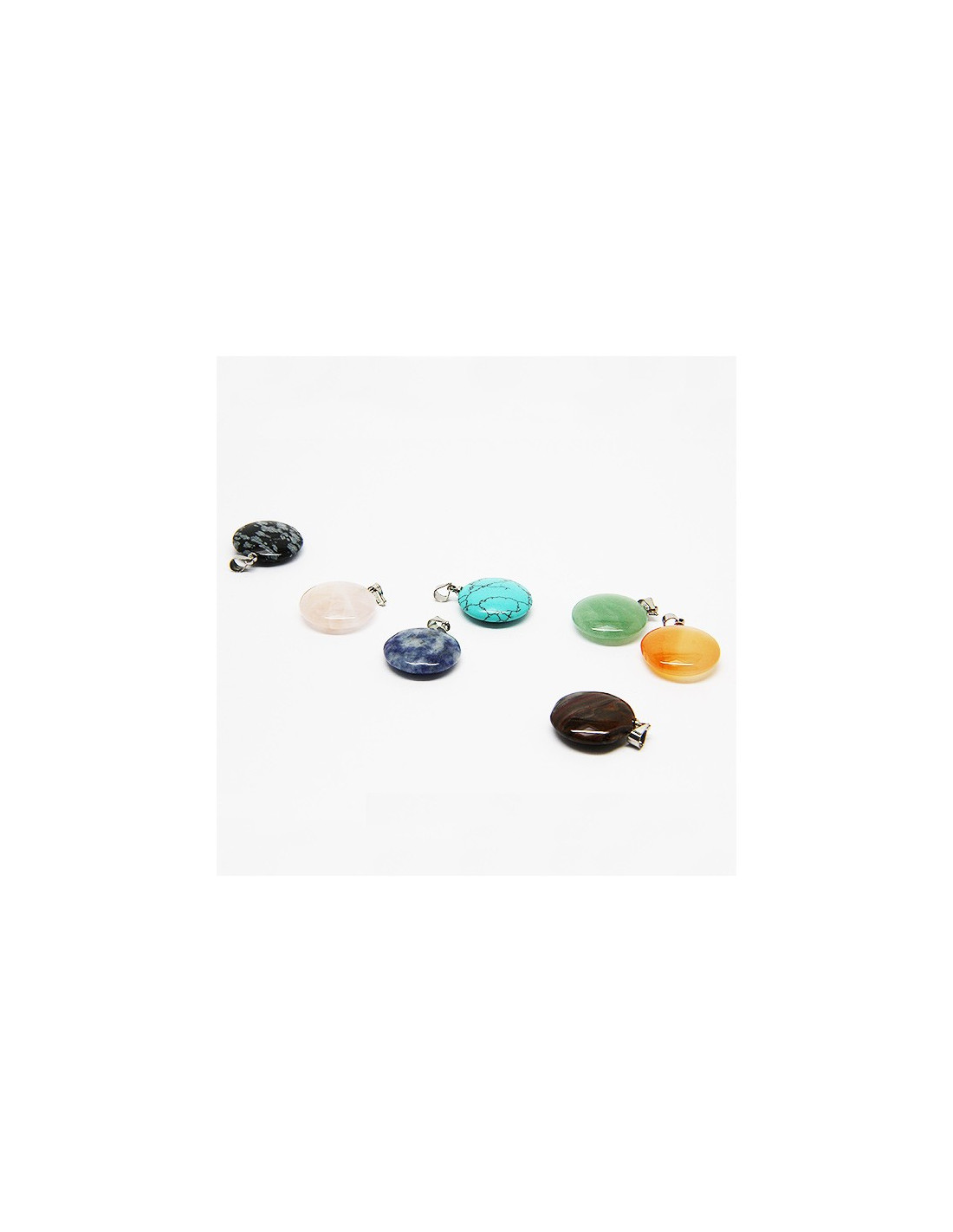 Questa collana viene fornita con 7 ciondoli rotondi. Le sette pietre sono ossidiana a fiocco di neve, corniola, occhio di tigre, quarzo rosa, avventurina verde, turchese ricostituito e sodalite.