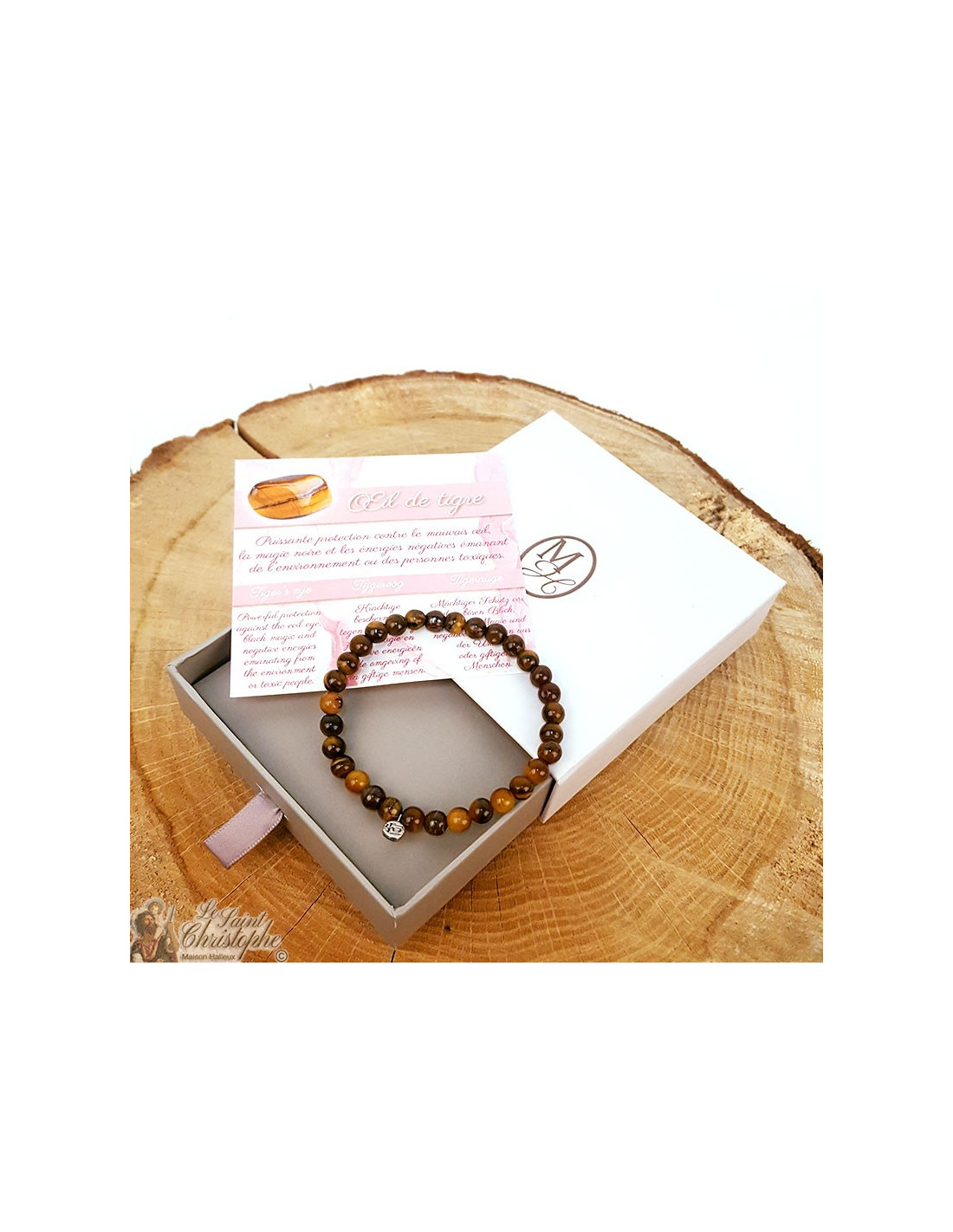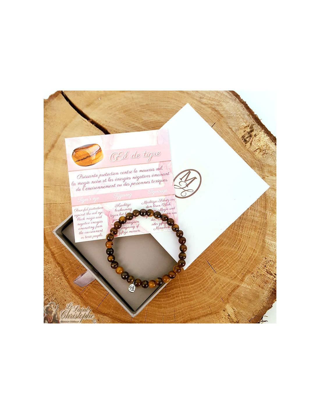Marrone e ocra con riflessi fiammeggianti, l'occhio di tigre è una potente pietra protettiva che si prende cura di chi la indossa rimandando indietro il malocchio e le energie negative dell'ambiente o delle persone tossiche. Aiuta anche a regolare le emozioni di chi lo indossa, rendendolo impermeabile alle emozioni esterne che possono sopraffare le persone ipersensibili. L'occhio di tigre è anche benefico per stimolare la forza di volontà e la motivazione, per guadagnare fiducia in se stessi e per bandire la depressione per portare gioia, buon umore, creatività e ottimismo. Nella litoterapia, sarebbe anche possibile utilizzarlo per alleviare i dolori articolari, per rinforzare il metabolismo, per diminuire gli attacchi d'asma, per fluidificare e regolare la digestione.