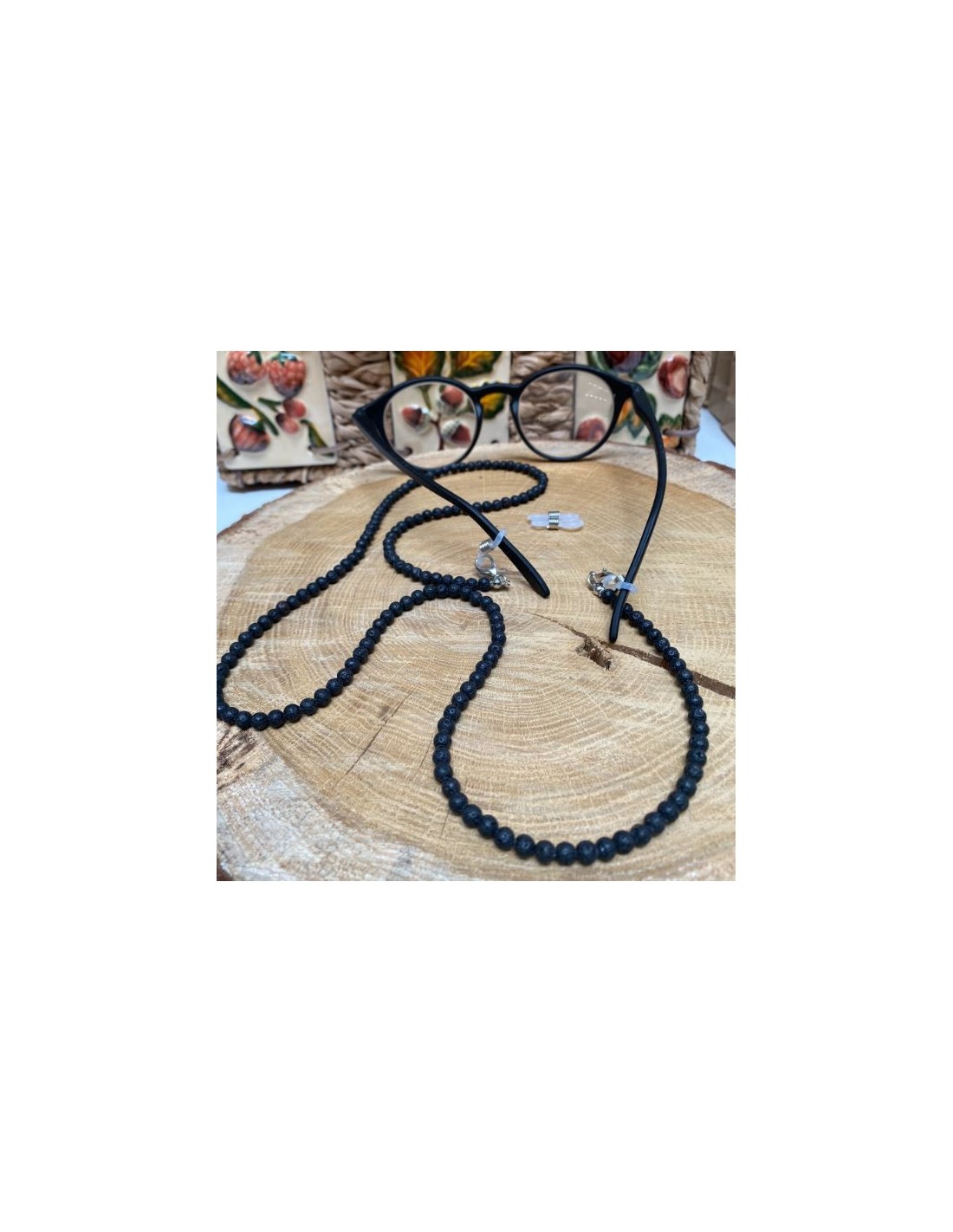 Questo cordoncino per occhiali è un accessorio chic e pratico. Pratico per tenere gli occhiali senza doverli indossare, chic grazie alle perle di pietra lavica, una pietra pregiata rinomata in litoterapia per le sue virtù.