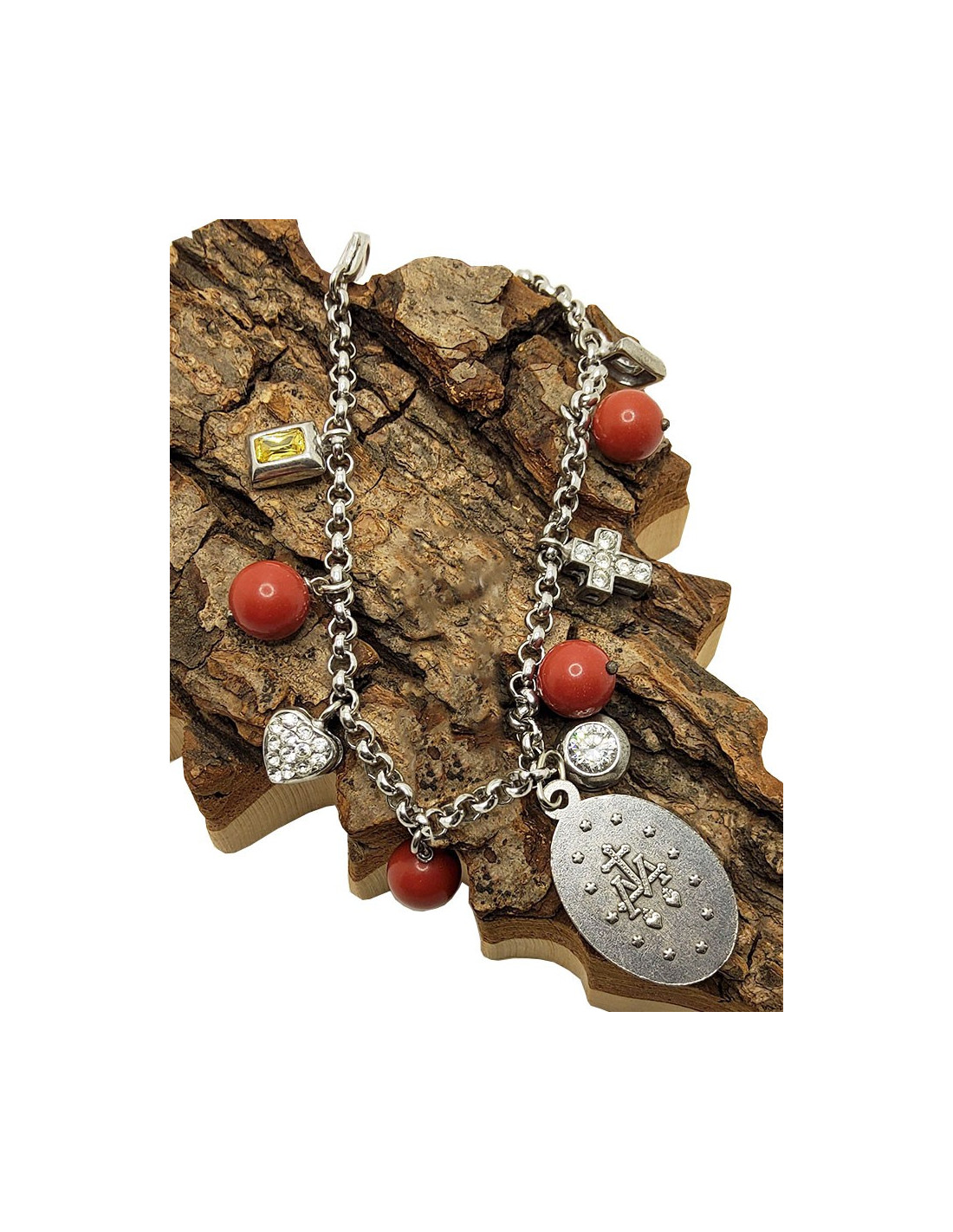 Bracciale in argento 925 con medaglia della Vergine Miracolosa, ciondoli in diaspro rosso e piccole decorazioni.