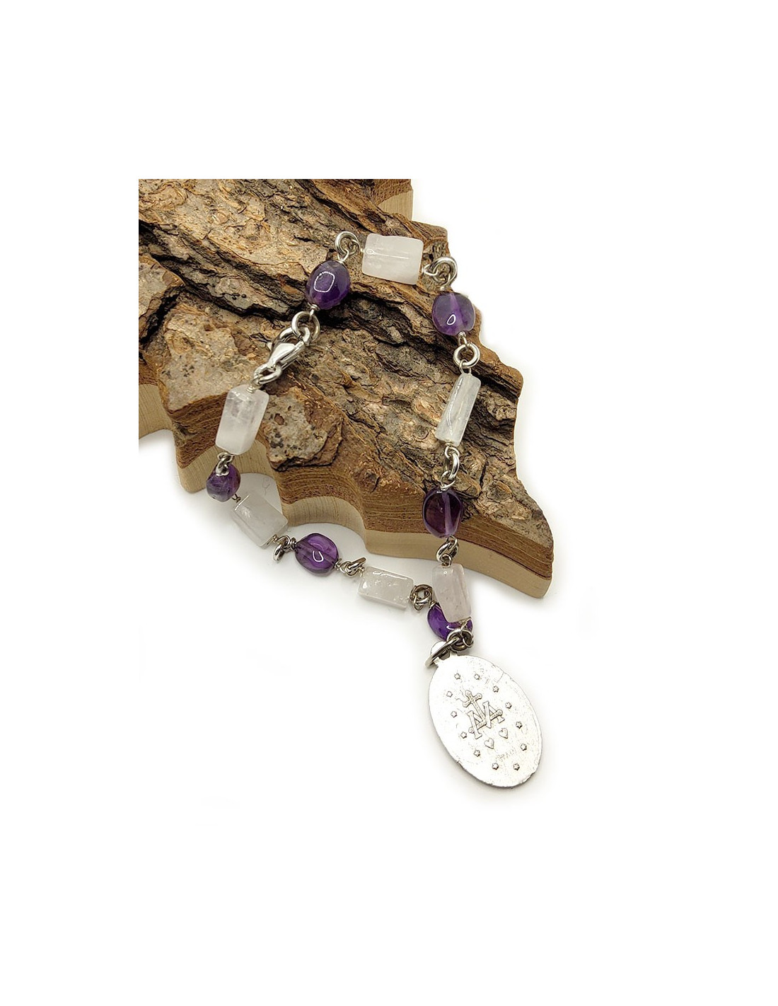 Bracciale in argento 925 con medaglia della Vergine Miracolosa, perle di ametista e cristallo di rocca.