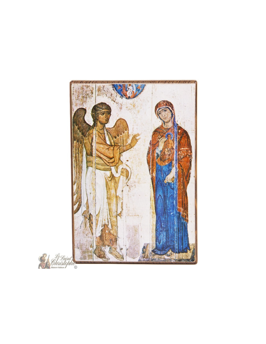 Questa icona di carta rappresenta l'Annunciazione, la scena in cui l'angelo Gabriele annuncia a Maria che porterà in grembo il Bambino di Dio. Ispirata a un'opera del XII secolo della scuola di Novgorod, raffigura la beata Maria, con Gesù già visibile nel suo cuore. Il documento è montato su un supporto di legno, coniugando sobrietà e profondità spirituale. Un oggetto sacro e stimolante, perfetto per la preghiera o la meditazione.