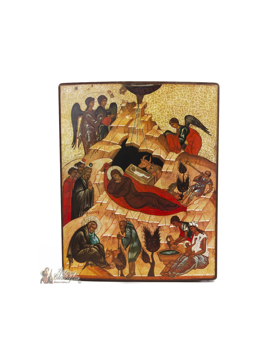 Questa icona della Natività del Signore Gesù Cristo, fedele alla tradizione bizantina del XV secolo, rappresenta la scena sacra della nascita di Gesù, circondato dalla Vergine Maria, dagli angeli, dai pastori e dai Magi. Ogni dettaglio è portatore di un profondo significato teologico, in una composizione ricca di simboli. Lo stile antico e le tonalità calde conferiscono a questa stanza una forte dimensione spirituale. Un oggetto di preghiera tanto quanto di bellezza, per ogni meditazione religiosa interiore o personale.