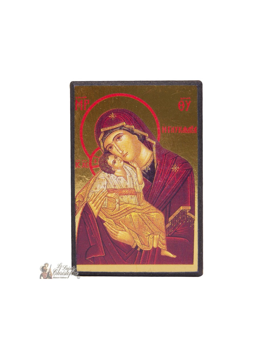 Questa piccola icona adesiva rappresenta la Vergine della Tenerezza, un tipo iconografico in cui Maria tiene teneramente il Bambino Gesù contro la sua guancia. Lo sfondo dorato evoca la luce divina. L’espressione dolce e amorevole della Madre di Dio richiama l’amore incondizionato e la compassione. Facile da riporre e trasportare, accompagna la preghiera personale e porta una presenza spirituale rilassante nella vita di tutti i giorni.