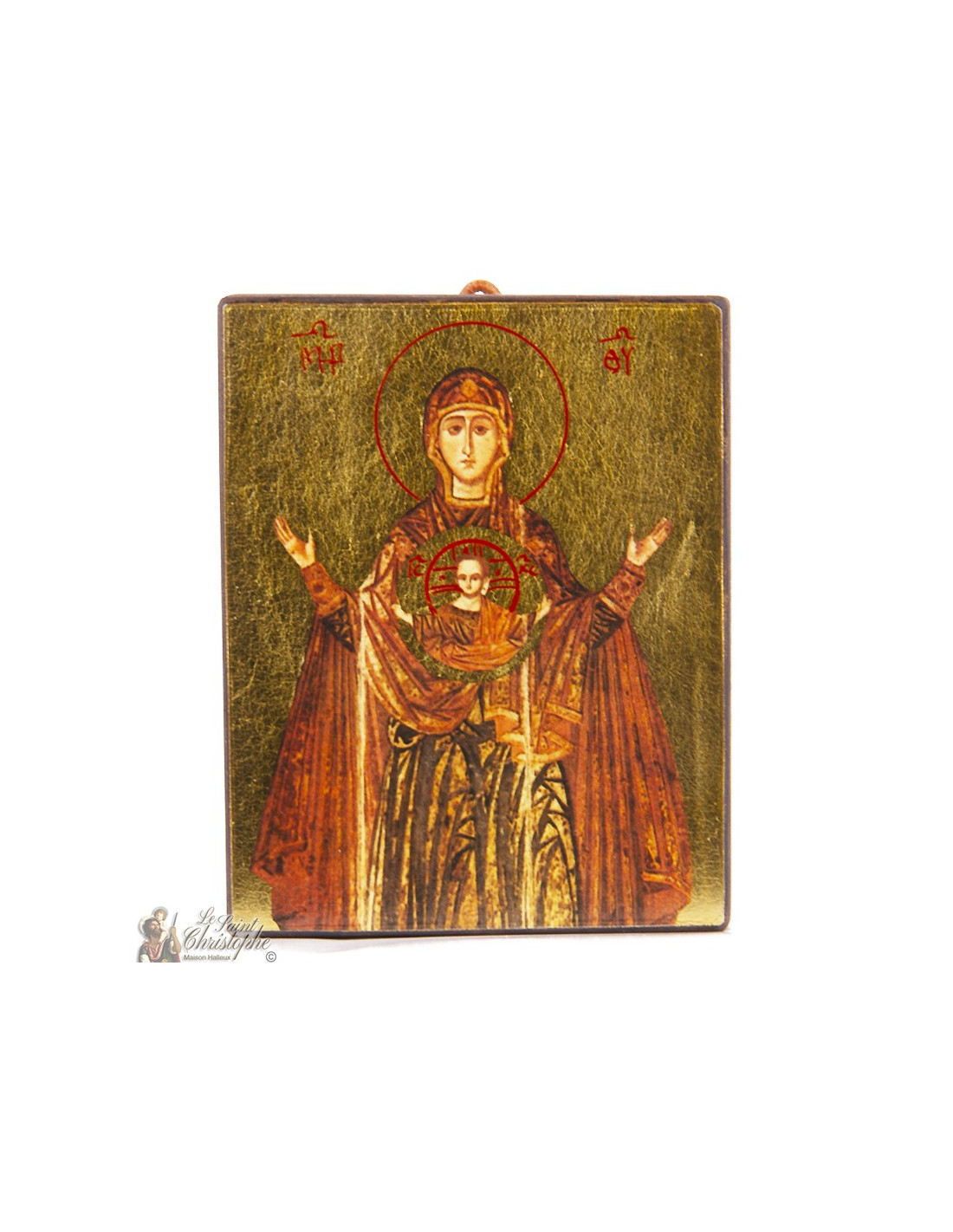 Questa icona ortodossa rappresenta la Madonna del Segno in atteggiamento di preghiera, con le mani alzate, e il Bambino Gesù che appare in un medaglione sul suo petto. È dipinto a mano su legno dorato con foglia d'oro. Si tratta di un'antica rappresentazione liturgica, ricca di significato teologico, ideale per la preghiera o come dono spirituale portatore di speranza.